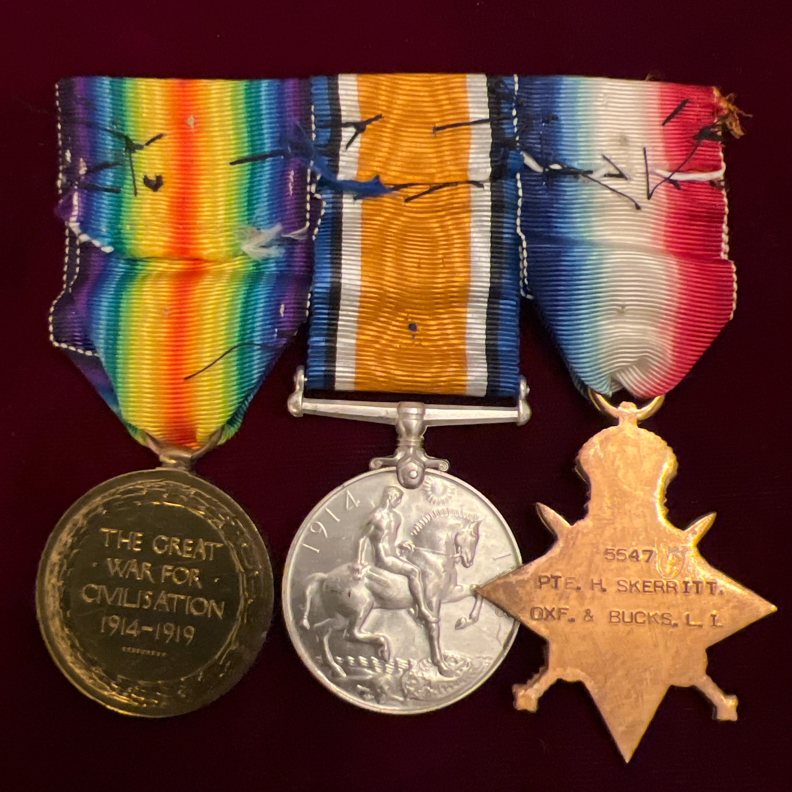 1914-15 Star trio to 5547 Private H. Skerritt, Oxford and Bucks Light Infantry