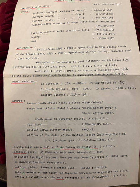 A fine O.B.E. group of 6 to Lieutenant Colonel Herbert Averill Elton, Royal Engineers, mentioned in despatches by Lord Kitchener, served South Africa and France, Fellow of the Surveyors Institute