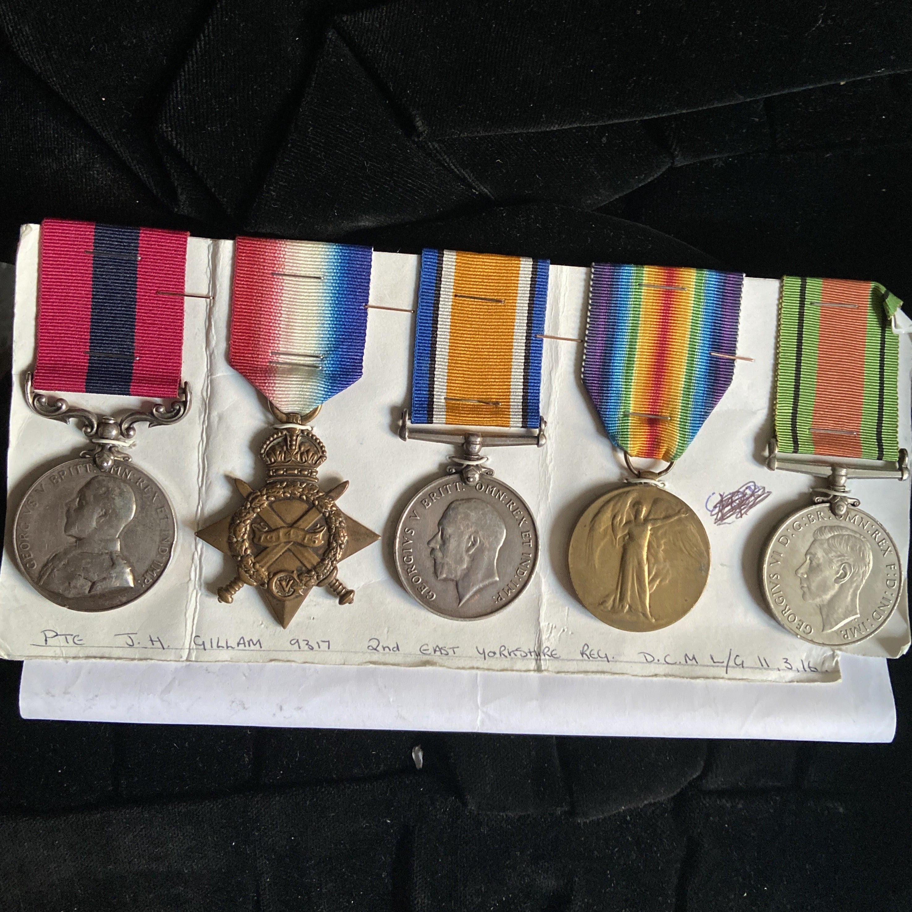 Distinguished Conduct Medal group of 5 to 9317 Pte. Joseph H. Gilliam, 2 East Yorkshire Regt., London Gazette: 11/3/1916, for conspicuous gallantry, after the enemy had blown in his trench with a mine he displayed great bravery and devotion to duty in digging out under heavy shell fire and rifle fire the men who had been buried. A little worn group, full service history