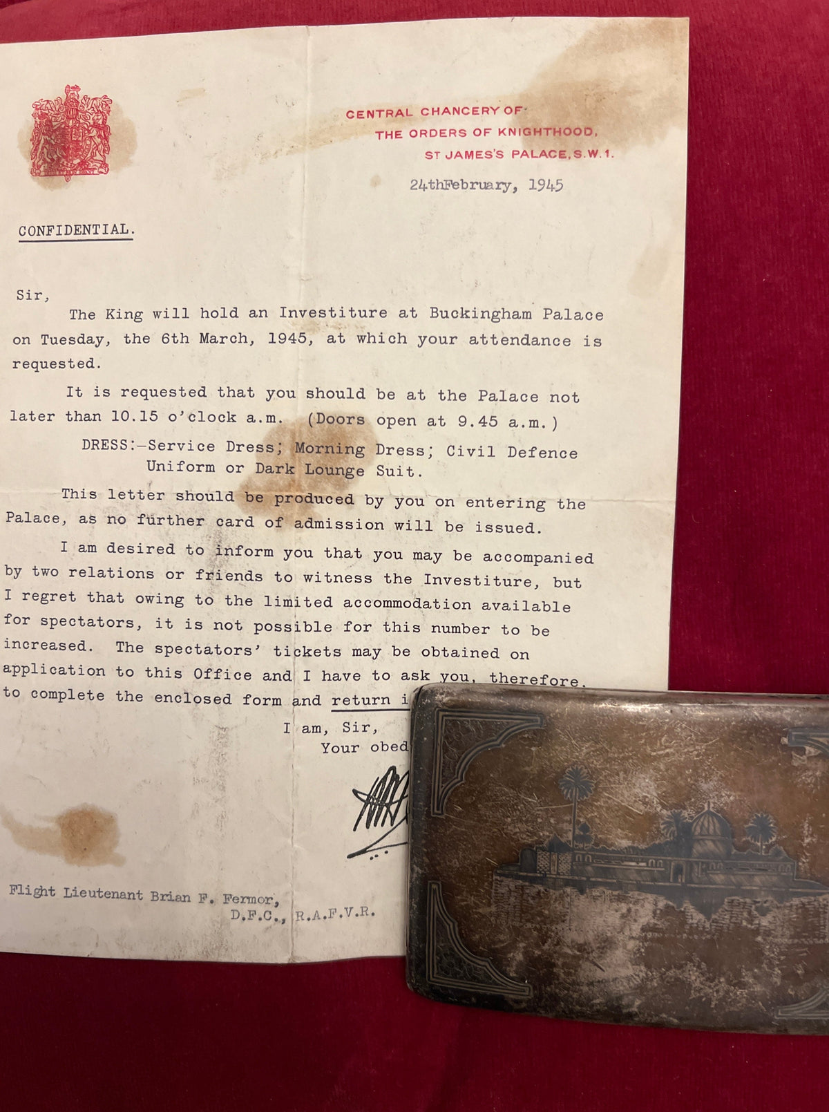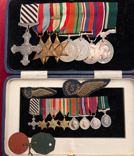 Distinguished Flying Cross group of 7 to 130710 Flying Officer Brian Frederick Fermor, 223 Squadron, RAF. Flying as a Wireless Operator Air Gunner since August 1940, he took part in the campaigns in Greece, Crete, Syria, Iraq and Persia, and has completed over 70 sorties. This group comes complete with his miniatures, a silver cigarette case with a mosque engraved at the front, dated Iraq 1941, at the back are engraved some ruins, complete with photo album, lots of photographs of Greece, Jerusalem, Palestine, Iraq & the Middle East, Air Efficiency Medal London Gazette 28th November 1946, Distinguished Flying Cross London Gazette 23rd July 1943, a scarce lot