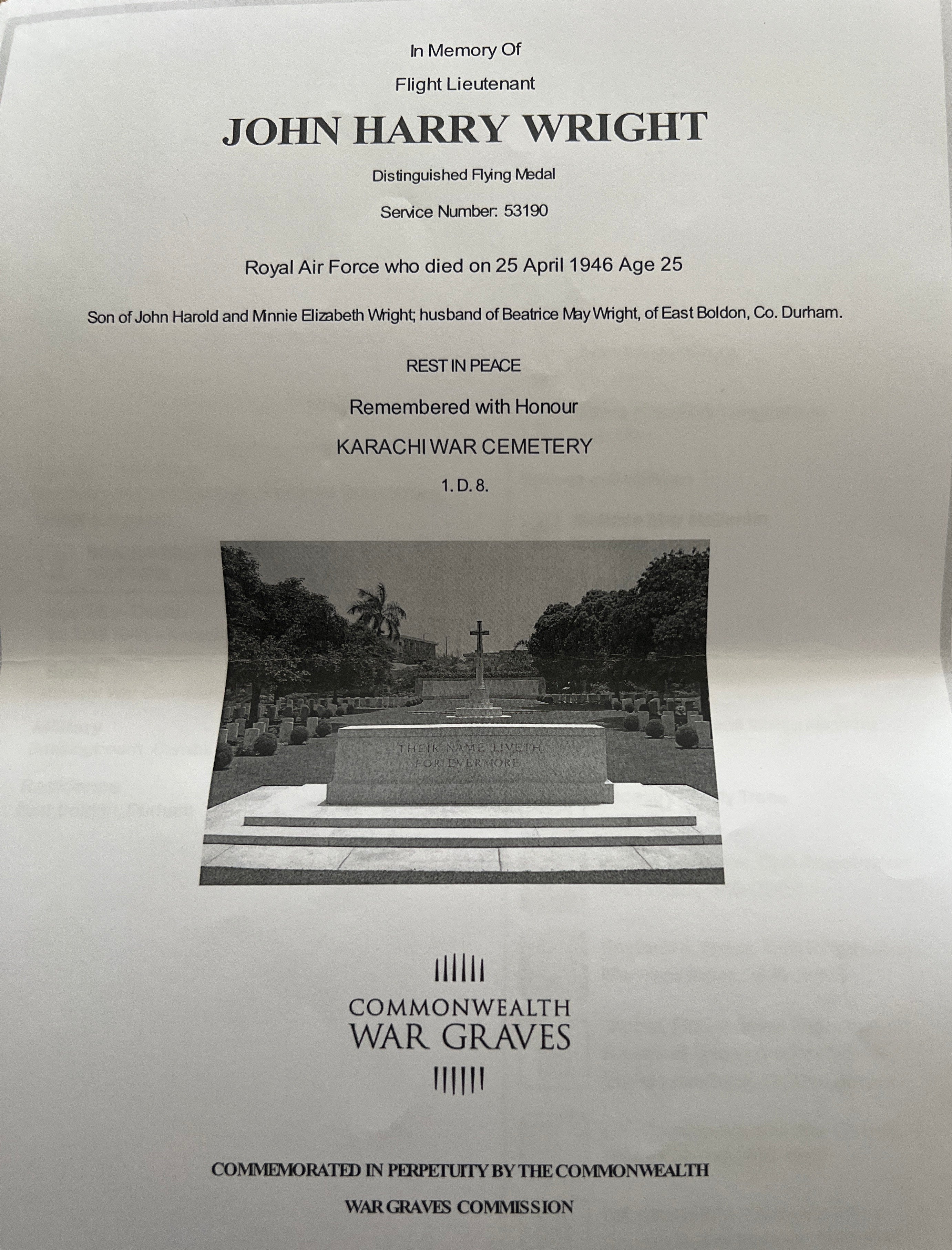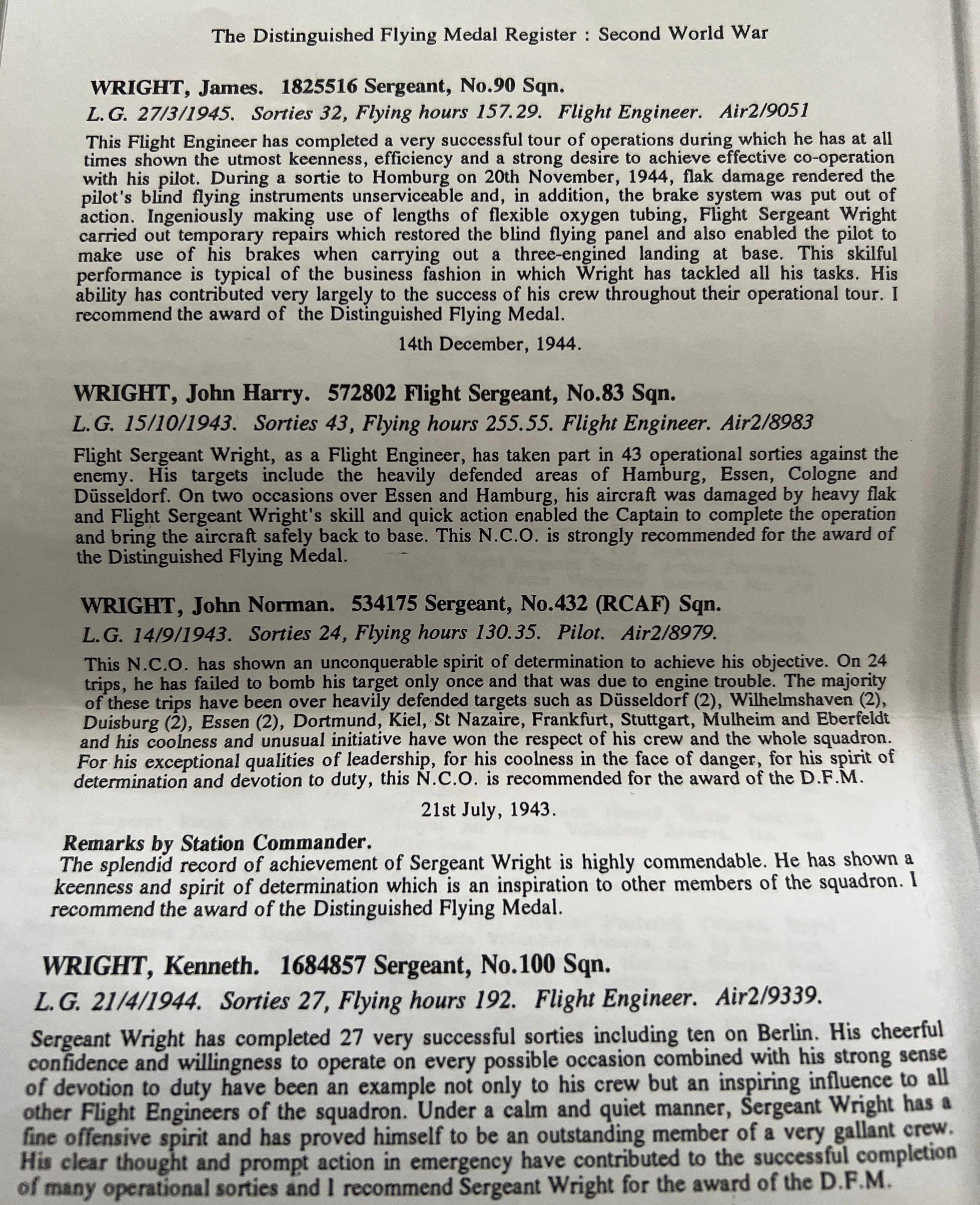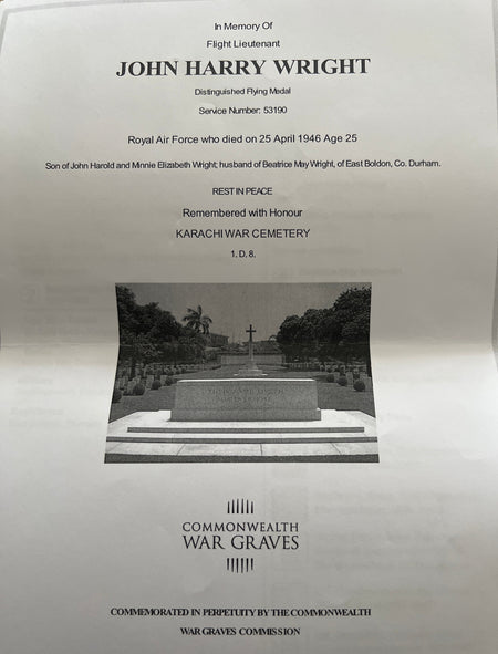 Distinguished Flying Medal to 572802 Flight Sergeant/ Flight Engineer John Harry Wright, 83 Squadron, RAF, took part in 43 operational sorties against the enemy, his targets included Hamburg, Essen, Cologne and Düsseldorf, on two occasions over Essen and Hamburg his aircraft was damaged by heavy flak, later he went to the Far East where he died in service on 25th April 1946, remembered with honour at Karachi War Cemetery, see history