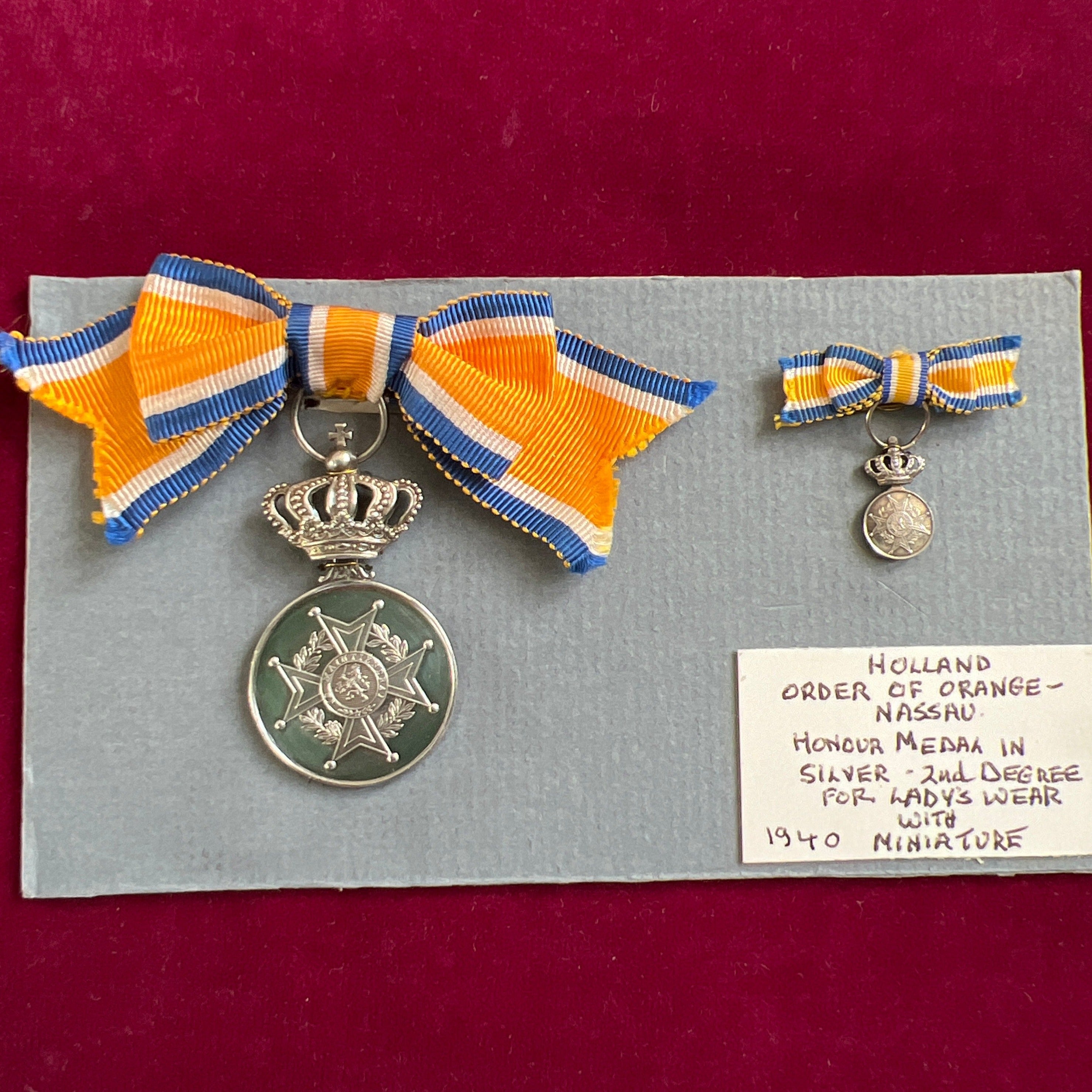 Dutch medal to the Order of Orange, Nassau, 2nd class, in silver on ladies' bow, with miniature