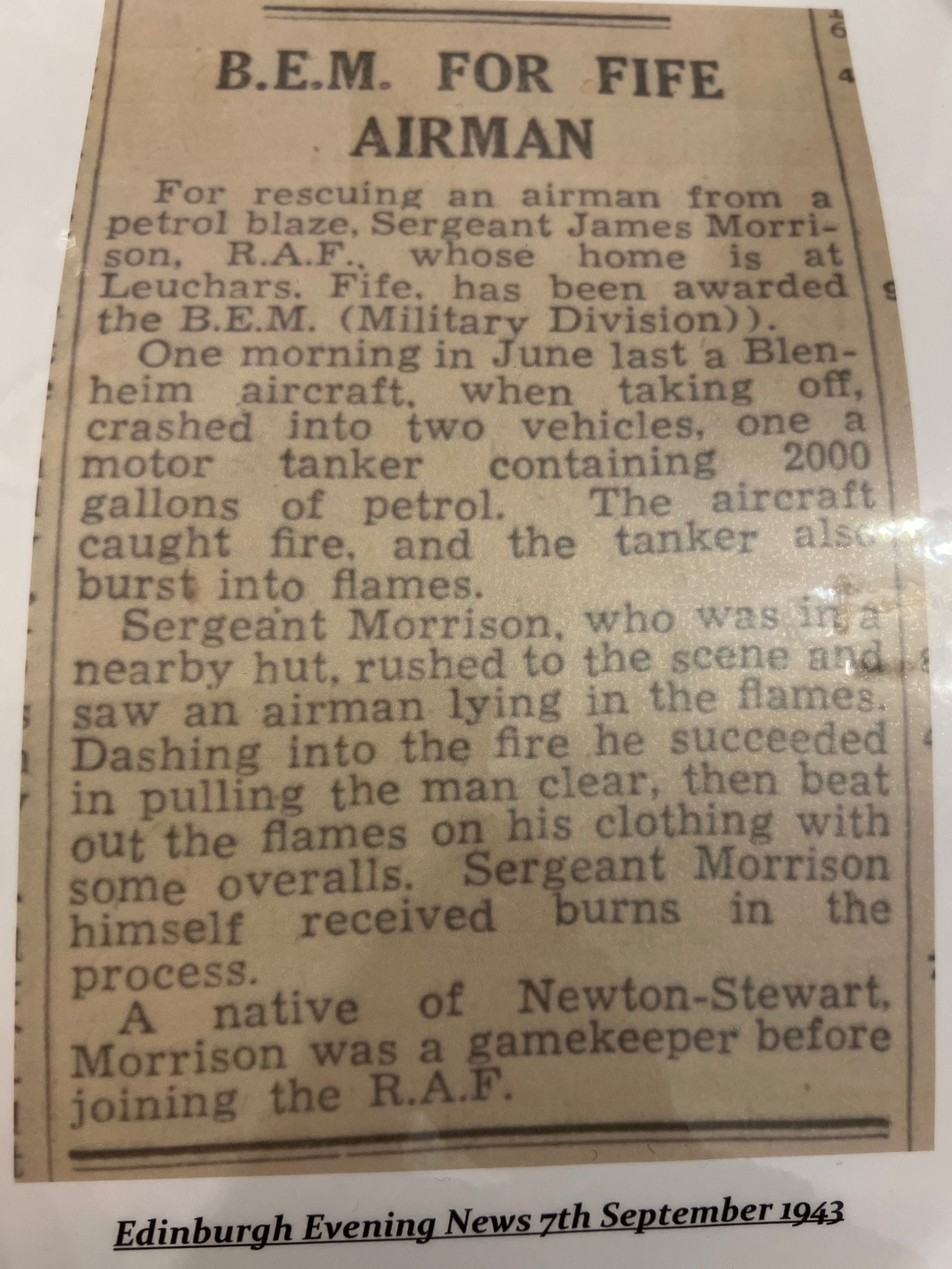 Father and son RAF group, BEM for bravery to Sgt James Morrison for rescuing an airman from a blazing Blenheim crash involving a petrol tanker, with original box, investiture letter, newspaper report, and son’s full RAF service medal group and history
