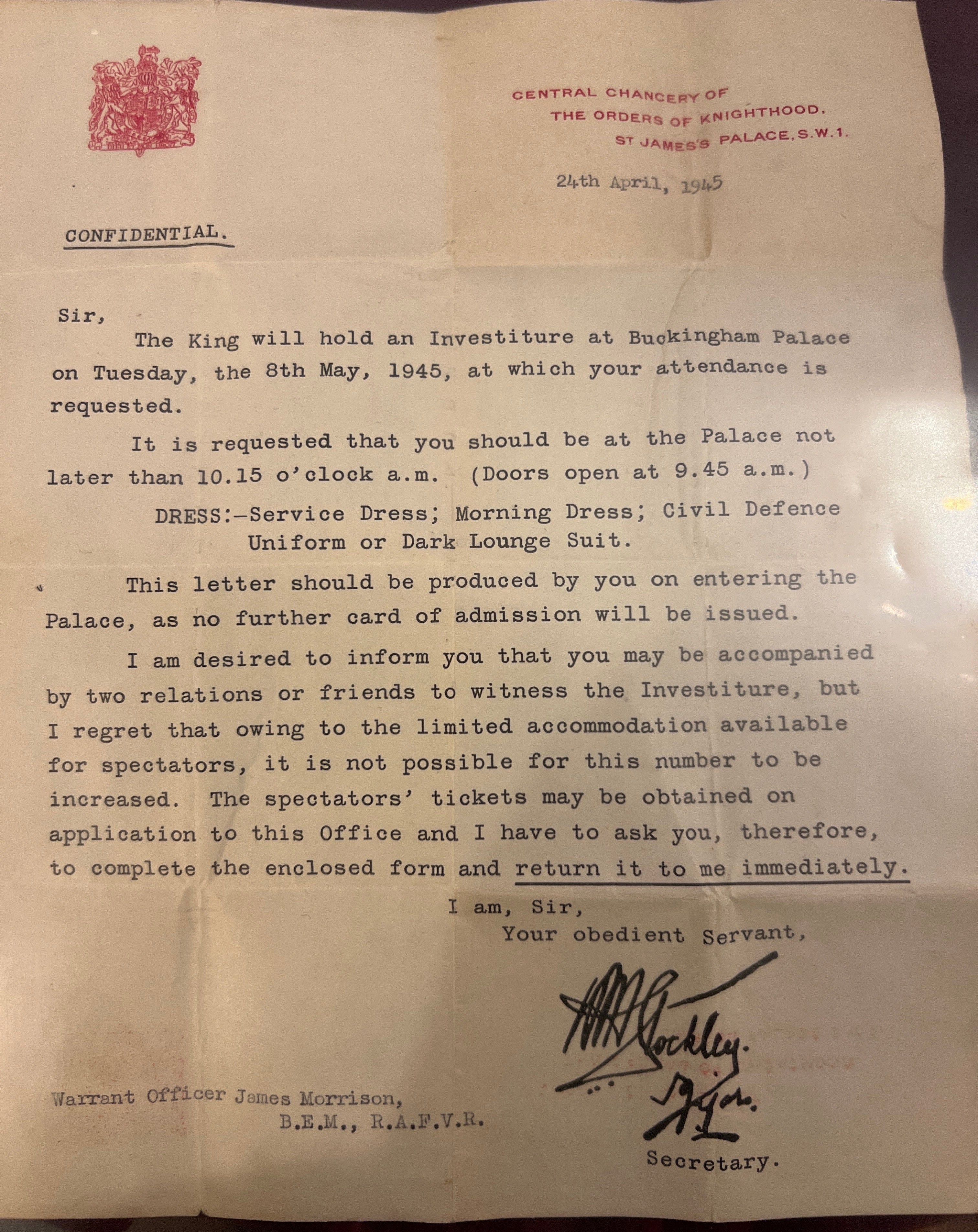 Father and son RAF group with the British Empire Medal (Military Division) for Bravery to 1366120 Sergeant James Morrison, RAF, awarded for rescuing an airman from a petrol blaze after a Blenheim aircraft crashed into vehicles including a motor tanker containing 2000 gallons of petrol, the aircraft and tanker bursting into flames, Morrison running from a nearby hut into the fire, pulling the airman clear and beating out the flames on his clothing with overalls, receiving burns himself (Edinburgh Evening News 7th September 1943), with original medal box of issue and original Buckingham Palace investiture letter dated 24th April 1945 for 8th May 1945, together with his son’s service group to 585359 Chief Technician W. McLagan Morrison, RAF, who joined as a 62 Entry at RAF Halton and graduated 27th May 1952, with full supporting history and paperwork.