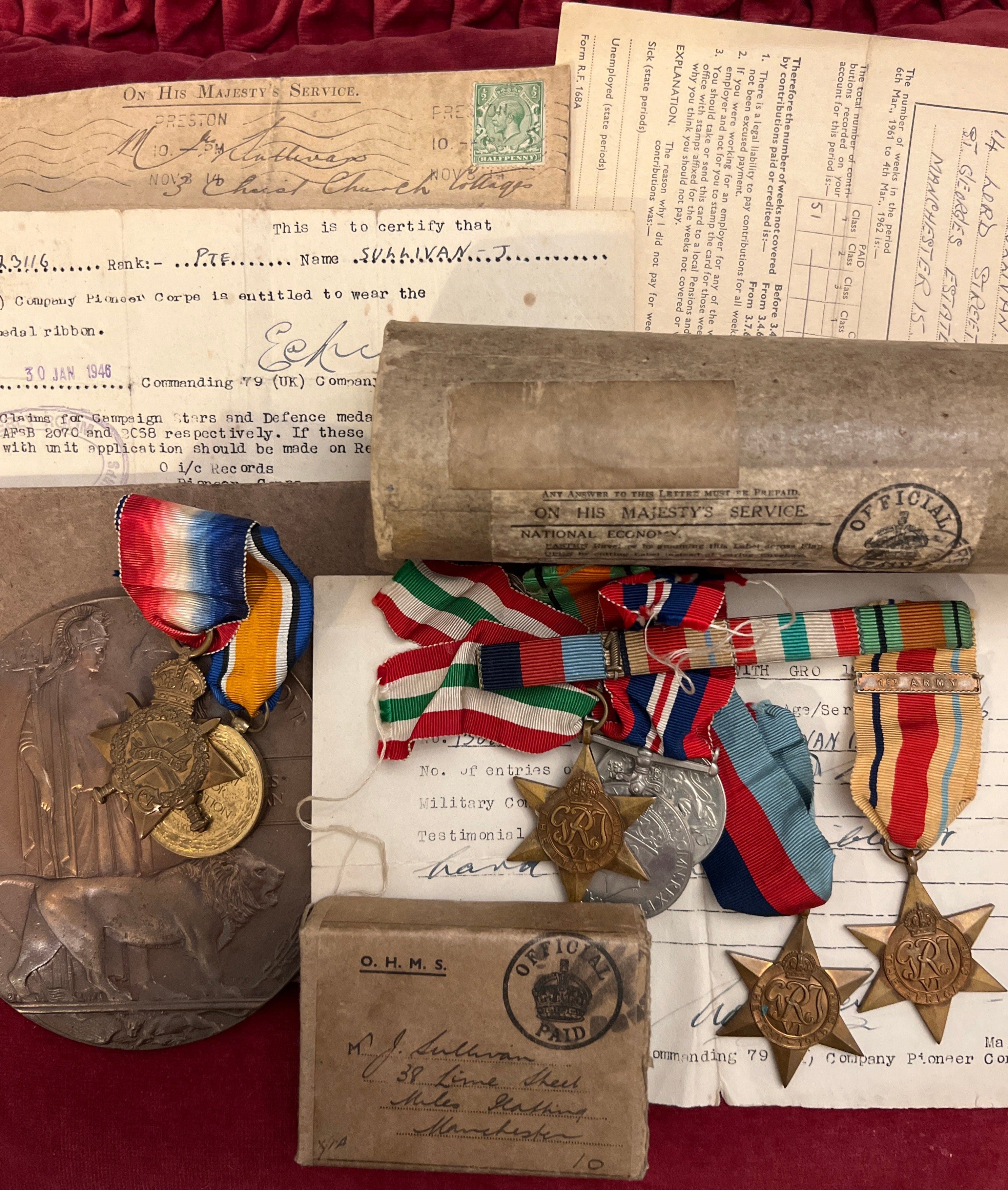 Charles Sullivan (father) killed in action with 6 Bn., Kings Own Royal Lancaster Regiment, 9th April 1916 in Mesopotamia, commemorated on the Amara War Cemetary, with scroll & plaque, missing War Medal.