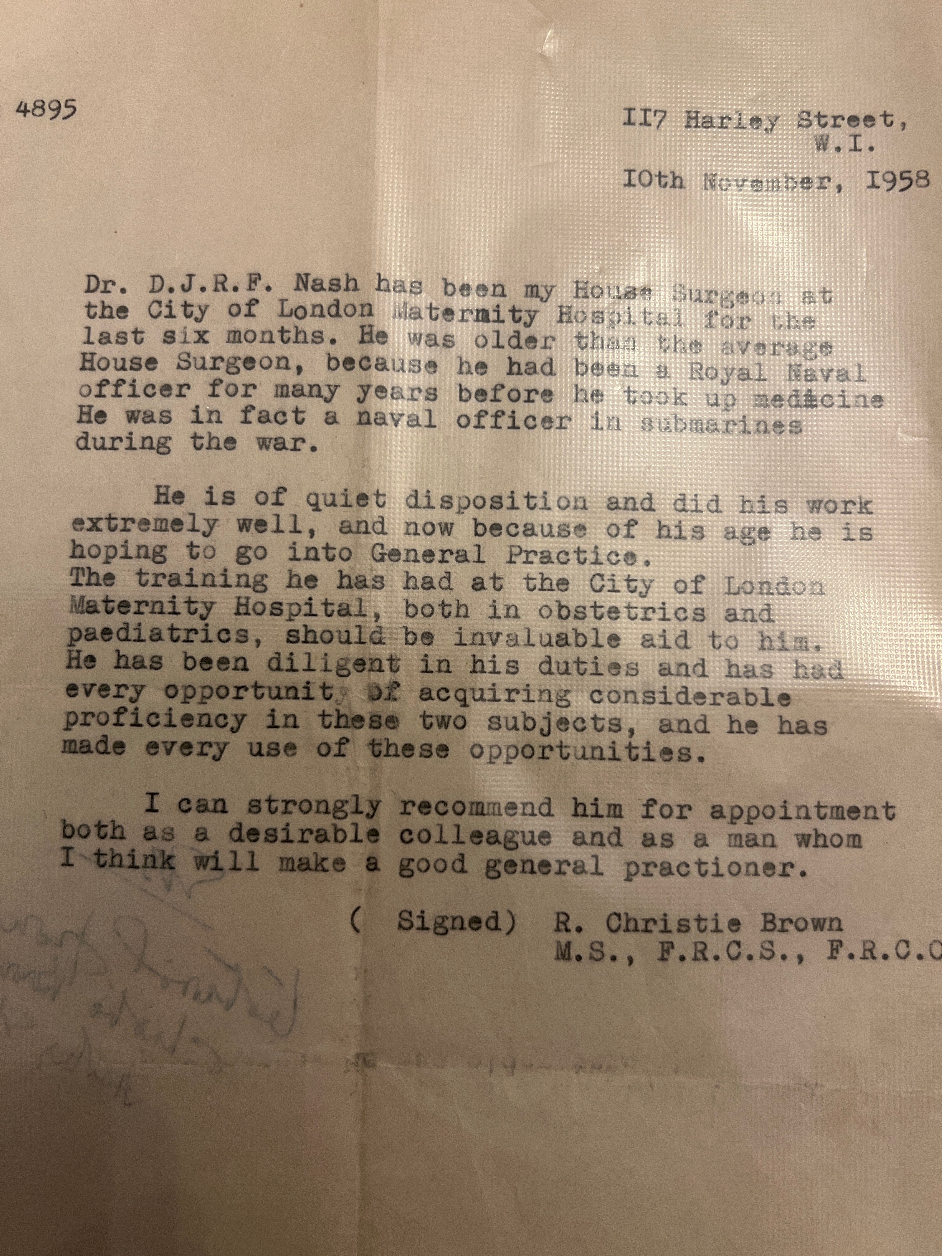 He continued service into WW2, serving on submarines. After the war he became a House Surgeon at the City of London Maternity Hospital, where he took up medicine (see included 1958 reference letter).