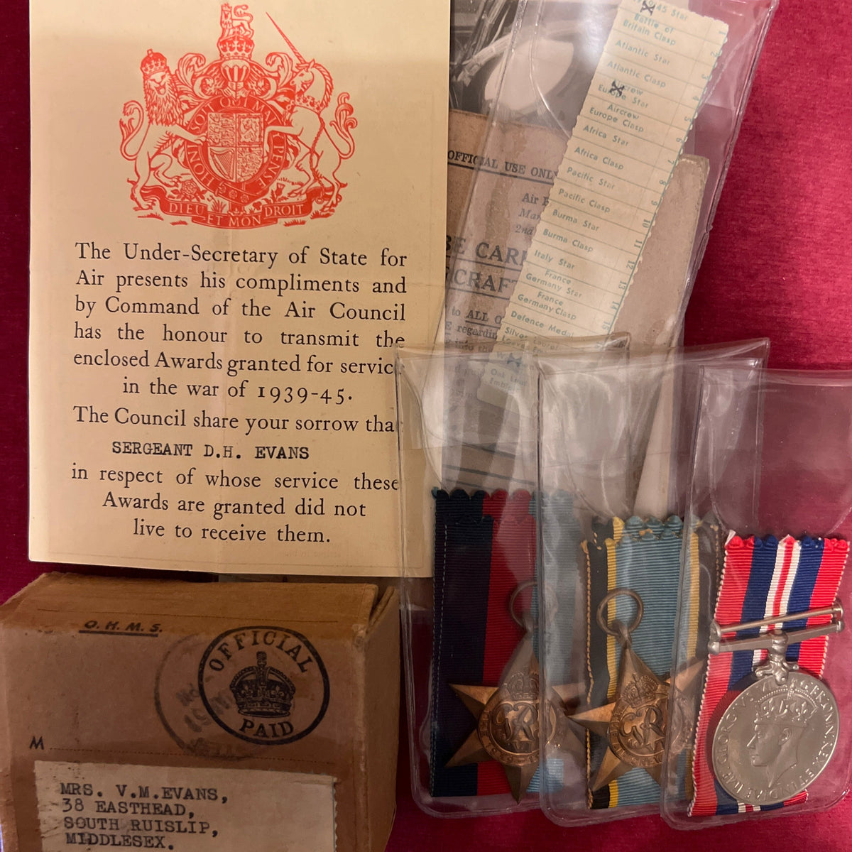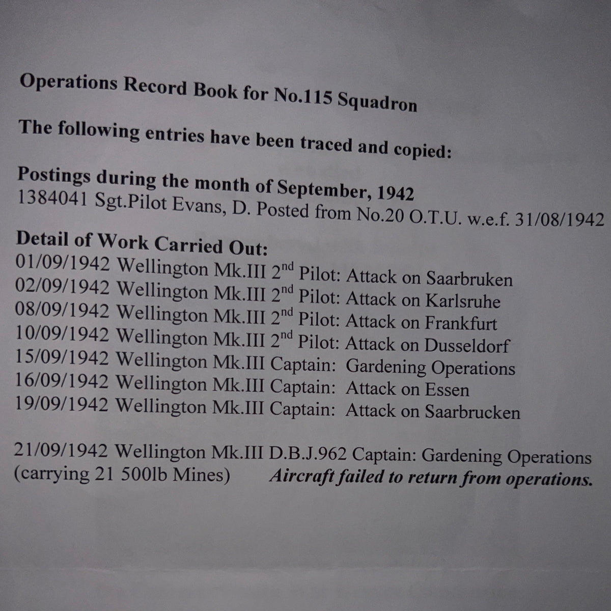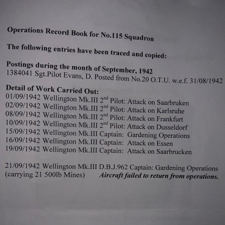 Group of 3 to 1384041 Sergeant Derek Henry Evans, RAF, killed in action carrying 21 500lb mines on an attack on Saarbrucken, 19/9/1942, Evans was a pilot with 115 Squadron and flew Wellingtons, includes history
