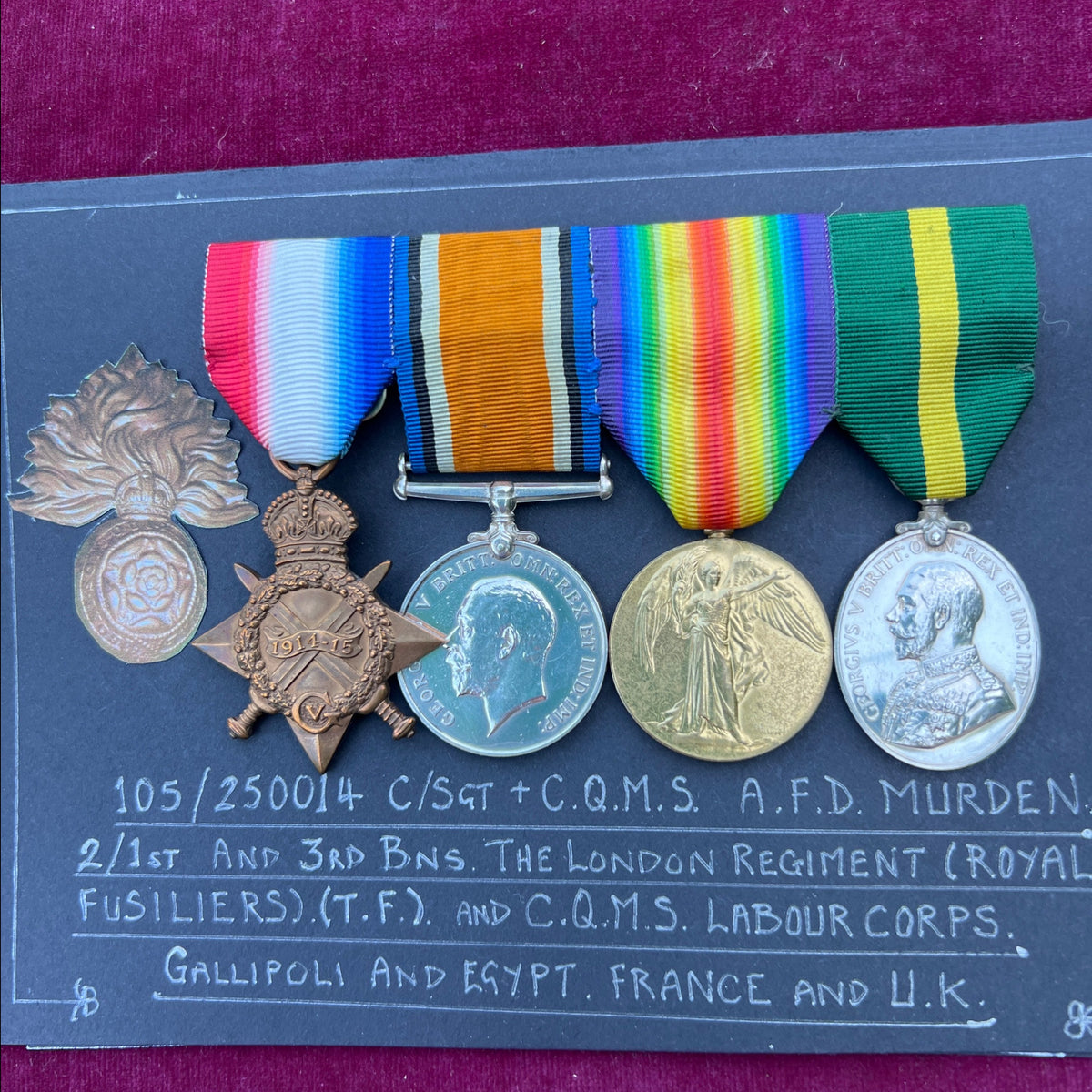 Group of 4 to 105/250014 C/Sgt. + C.Q.M.S. A.F.D. Murden, 2/1st & 3rd Battalions, The London Regiment (Royal Fusiliers)(T.F.) & C.Q.M.S. Labour Corps, Gallipoli & Egypt, Francs & UK