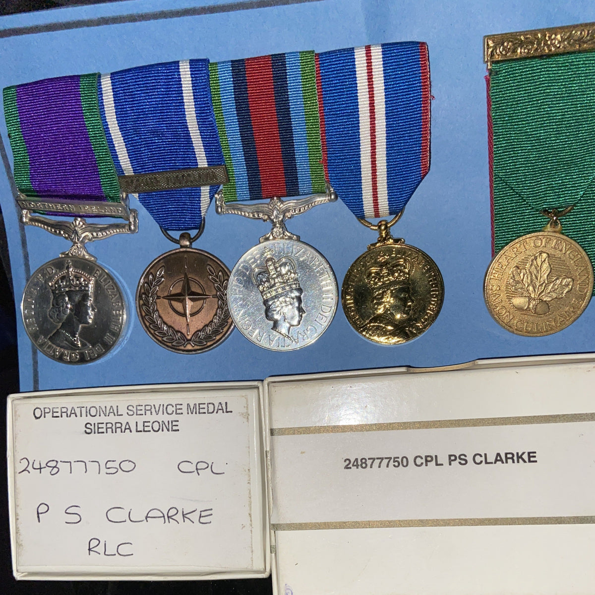 Group of 4 to 24877750 Corporal P. S. Clarke, Royal Logistics Corps, with scarce ribbon for Sierra Leone confirmed with box of issue for medal