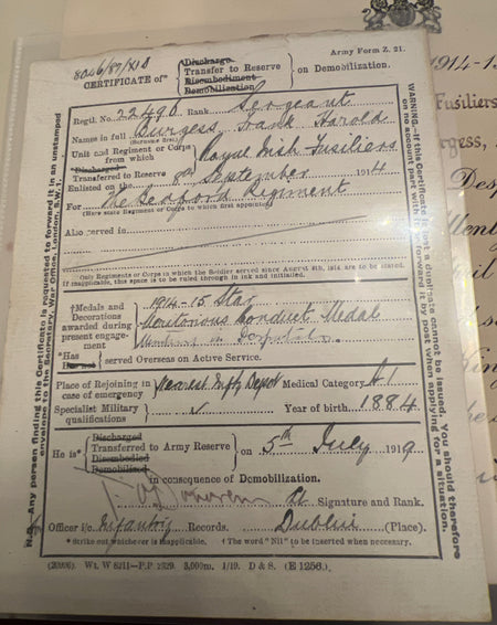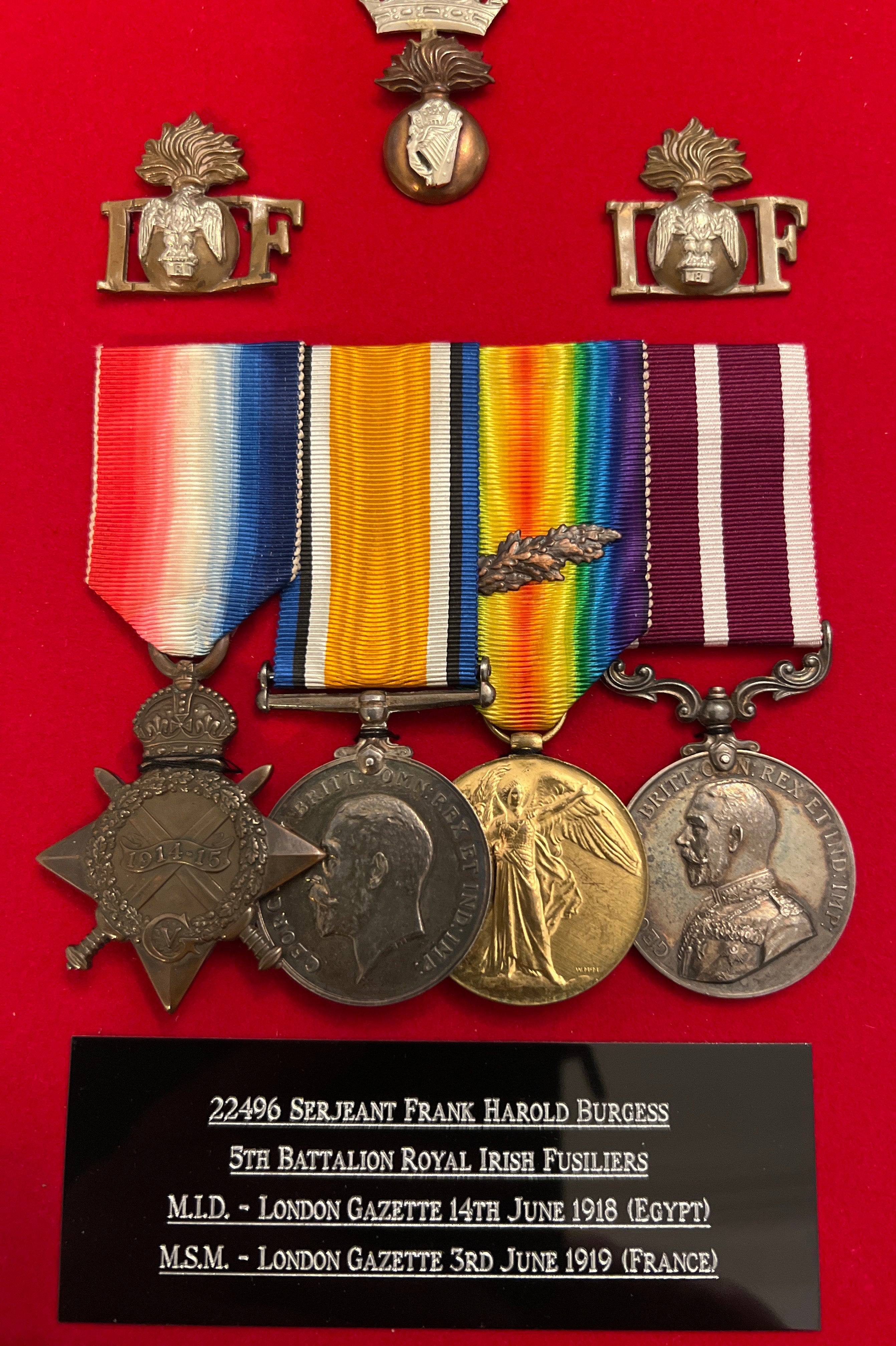Group of 4 to Sjt. Frank Harold Burgess, 5th Battalion, Royal Irish Fusiliers, served Balkans 6/12/1915, MiD LG: 14/6/1918 (Egypt), Meritorious Service Medal LG: 3/6/1919 (France), with his original enlistment paper and full service history