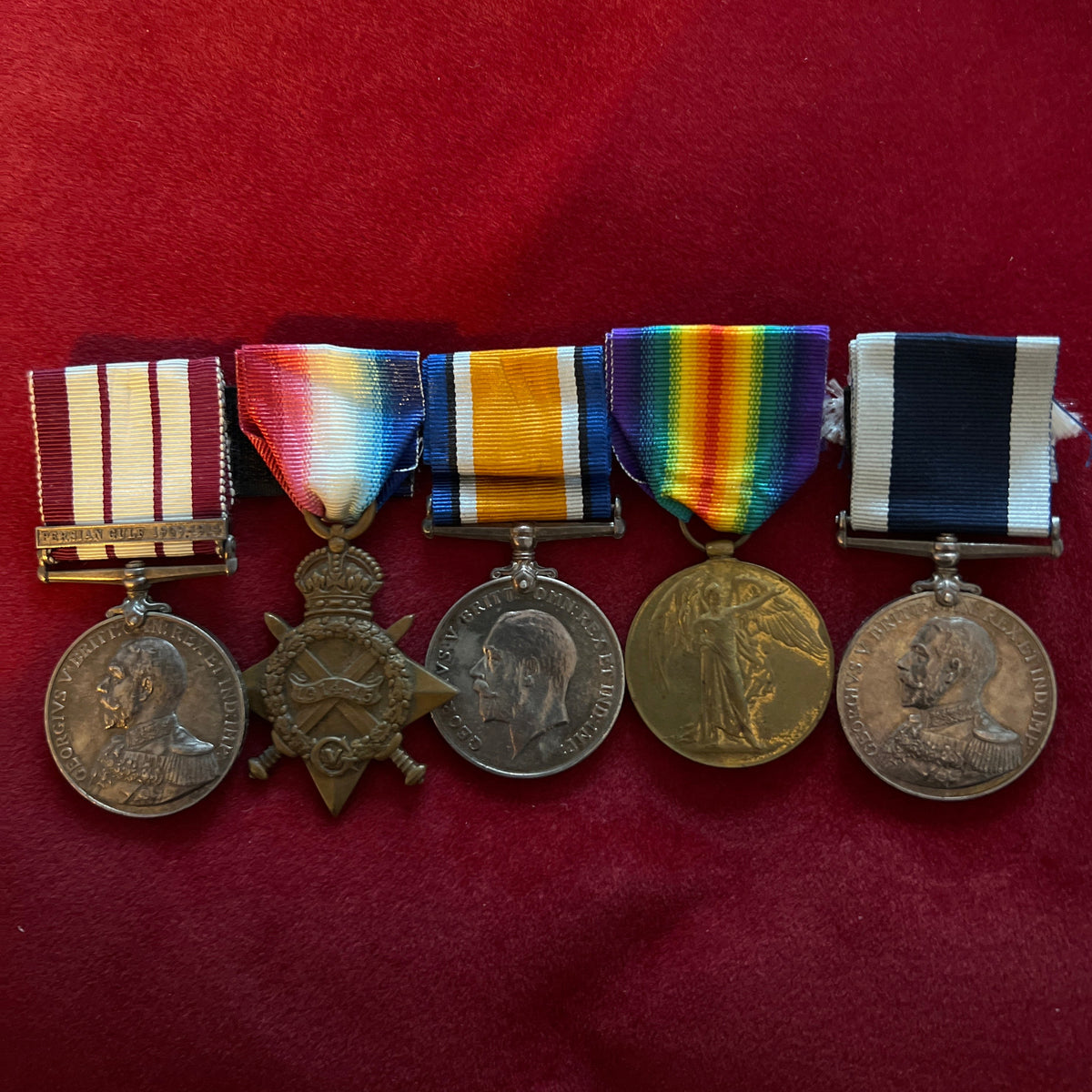 Group of 5 to 183950 Allan Carter, Royal Navy, HMS Pelorus on Naval General Service Medal (Persian Gulf 1909-1914 bar) and Alan Carter PO HMS Pelorus on Naval Long Service and Good Conduct Medal, with copy of service papers