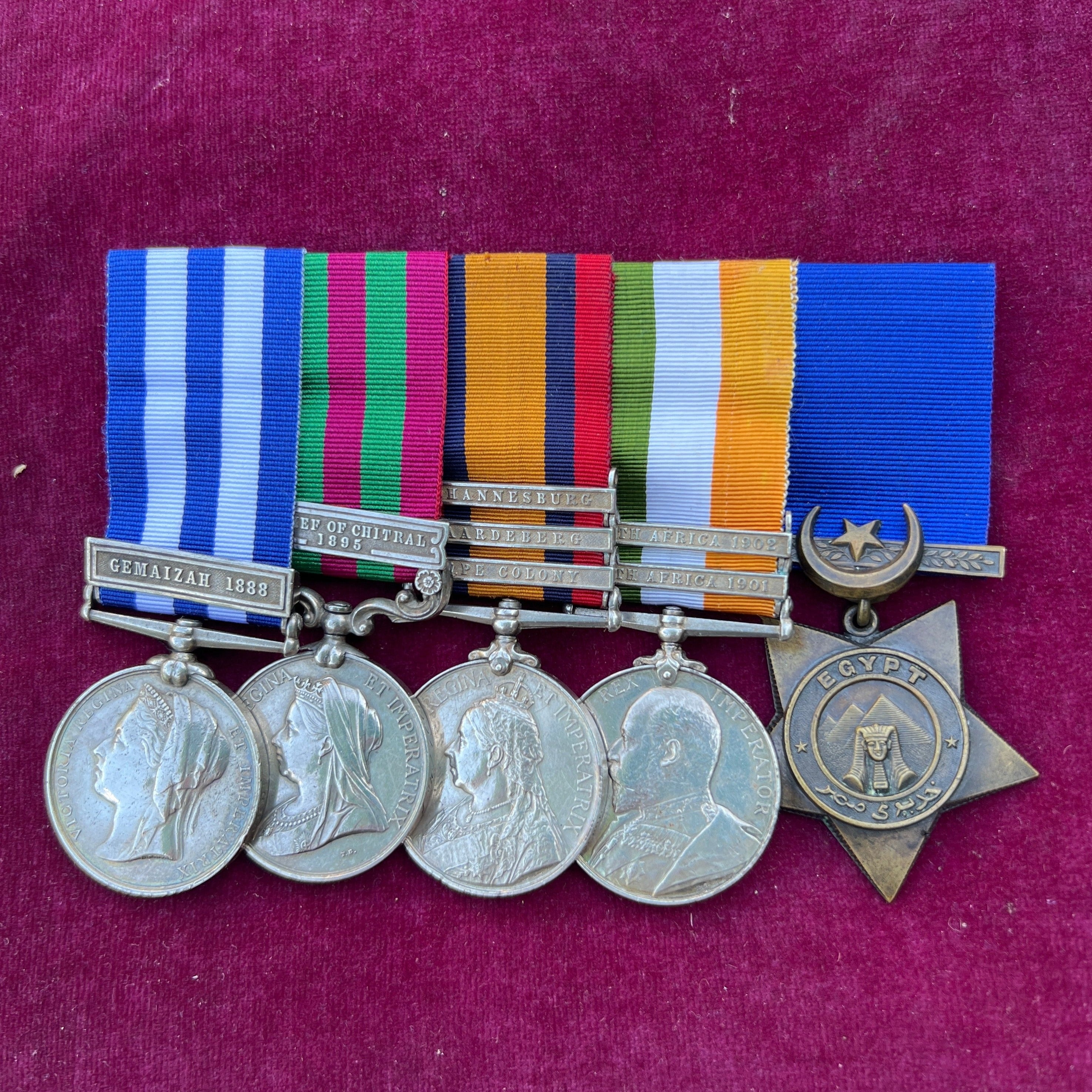 Group of 5 to 2554 Private J. Scott, 25th King's Own Scottish Borderers, served Egypt, India & South Africa. Geimaizah 1888, Khedive's Star (undated), India Medal, Relief of Chitral 1895 bar, QSA 3 bars & KSA, with full service history