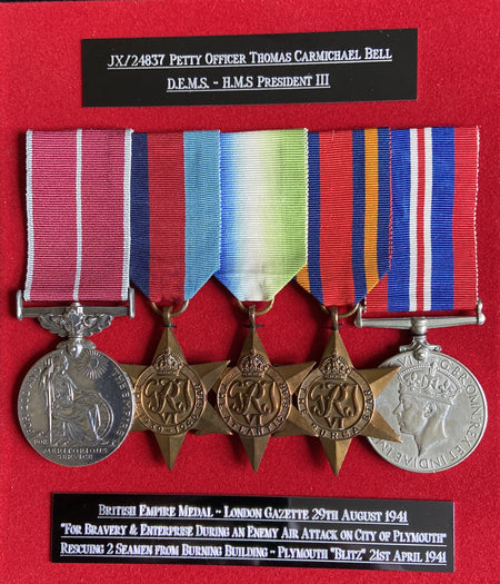 Group of 5 to JX/24837 Petty Officer Thomas Carmichael Bell, D.E.M.S., HMS President III, Royal Navy. Presented the British Empire Medal 4/12/1945 by the King, for bravery and enterprise during the Plymouth blitz. With original documents, see description