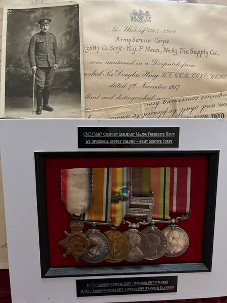 Company Sergeant Major Frederick John Murphy Huen, 63 Divisional Supply Column, Army Service Corps, MiD: LG 24/12/1917 (France), MSM: LG 18/1/1919 (France & Flanders), with certificates & photo. After the war he drove busses in Brighton