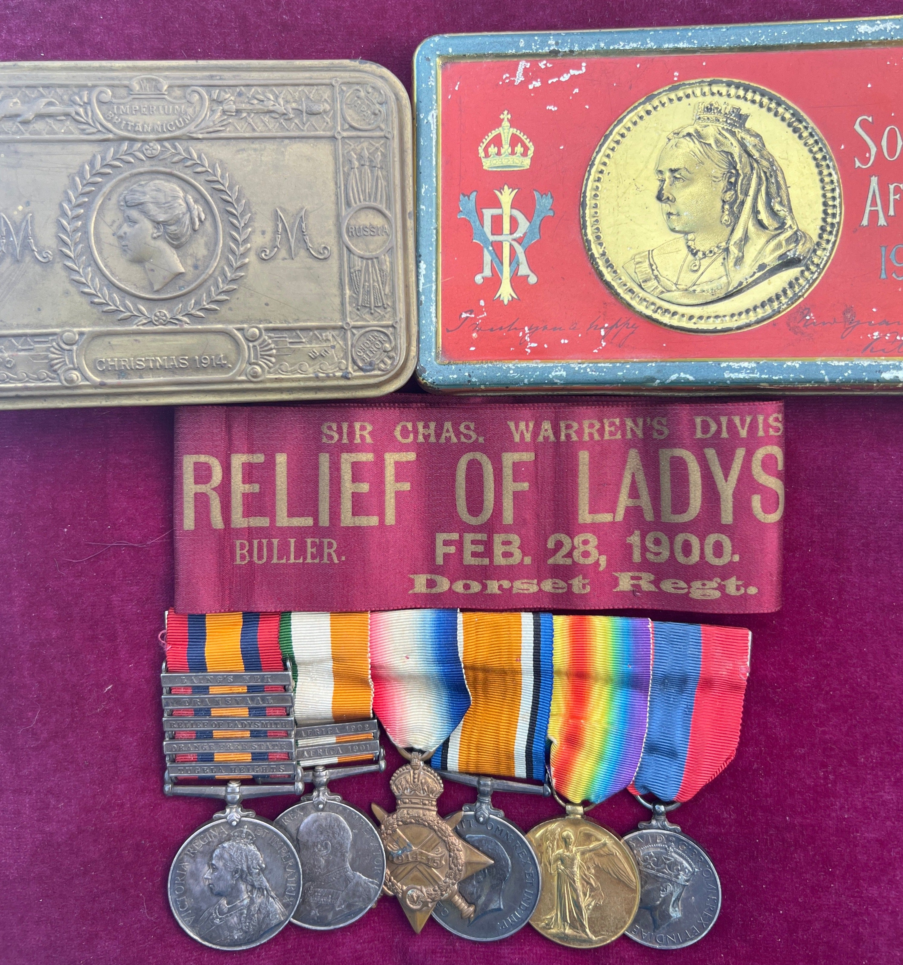 Group of 6 to Pte,/ Spr. Alfred E. Coates, Dorset Regiment, Royal Engineers. Present at the Relief of Ladysmith, Tugela Heights & Laing's Nek. With Princess Mary tin (WW1), South Africa Tin & ribbon for South African Relief of Ladysmith, Feb. 28, 1900