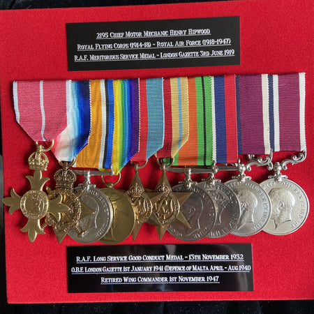 Group to 2195 Chief Motor Mechanic Henry Hipwood, RFC (1914-18) RAF (1918-1947) RAF Meritorious Service Medal (LG: 3/6/1919) RAF LSGC (13/11/1932) OBE (LG: 1/1/1941) Defence of Malta: April - Aug 1941, retired Wing Commander 1/11/1947, see description