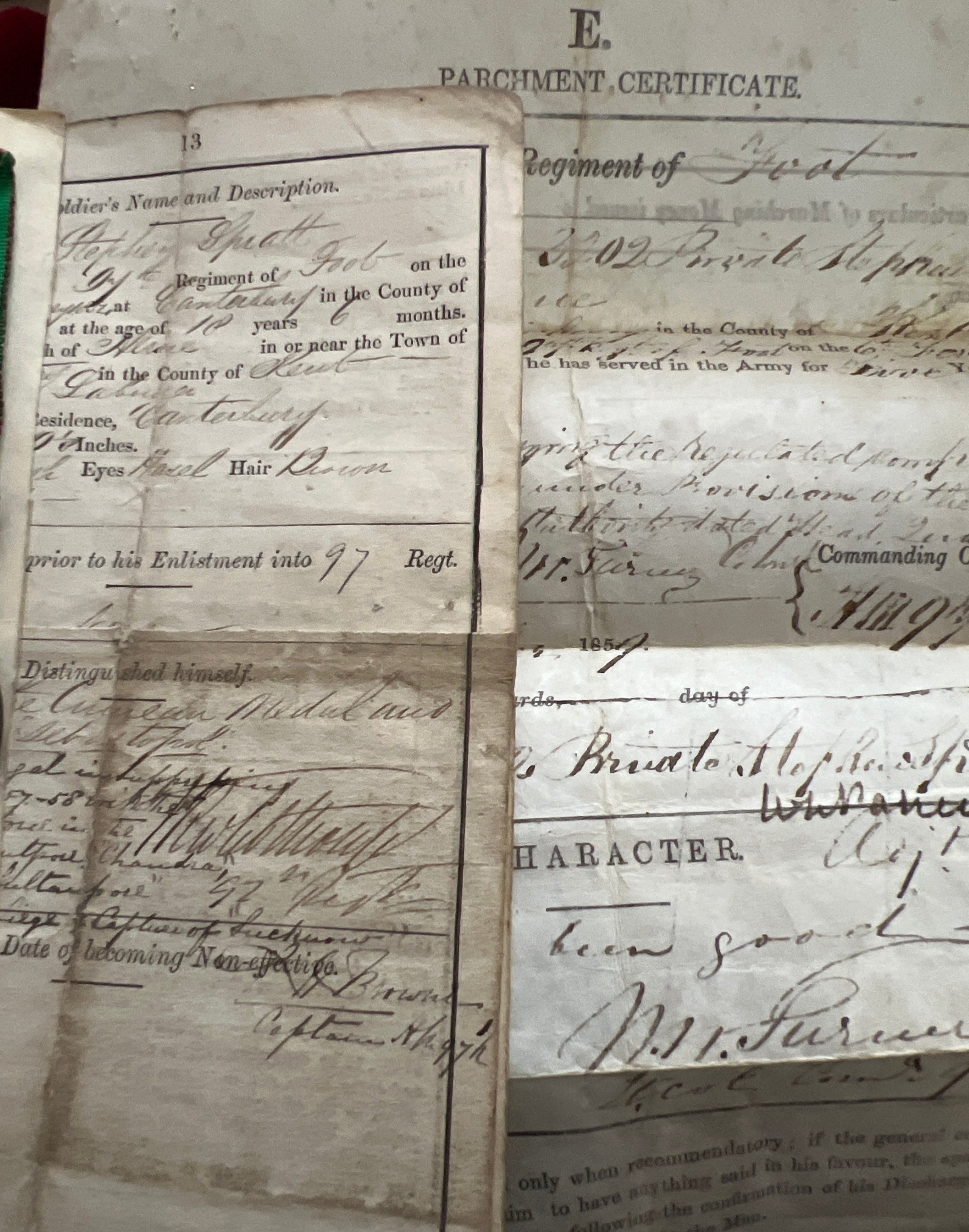 Group to 3202 Private Stephen Spratt, 97 Regiment of Foot, Crimea Medal, Sebastopol bar, Turkish Crimea Medal, Indian Mutiny Medal, Lucknow bar, after he served in the Calcutta Police, then Kent Constabulary 1866-1899, a good group with original papers
