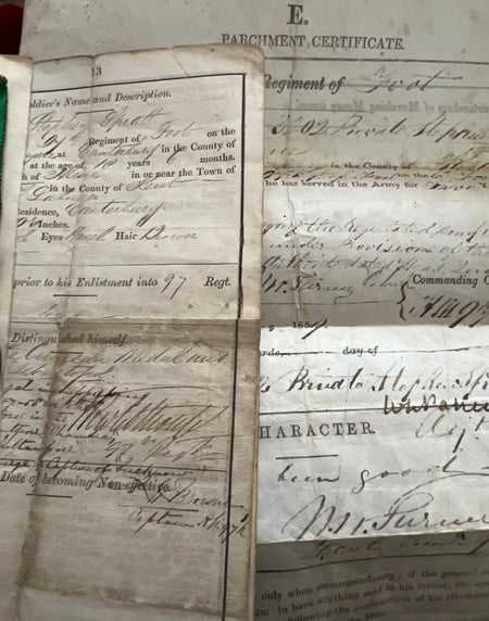 Group of 3 to 3202 Private Stephen Spratt of the 97 Regiment of Foot, medals in excellent condition with the original service papers showing he served in the Crimea at the Battle of Sebastopol, this medal is officially named, with his Turkish Crimea, this also named, then onto India where he served in the mutiny, Lucknow bar, after he served in the Calcutta Police, on his return he joined the Kent Constabulary and served from 31st December 1866 - 31st December 1899 and retired on a pension for life good, group with original papers