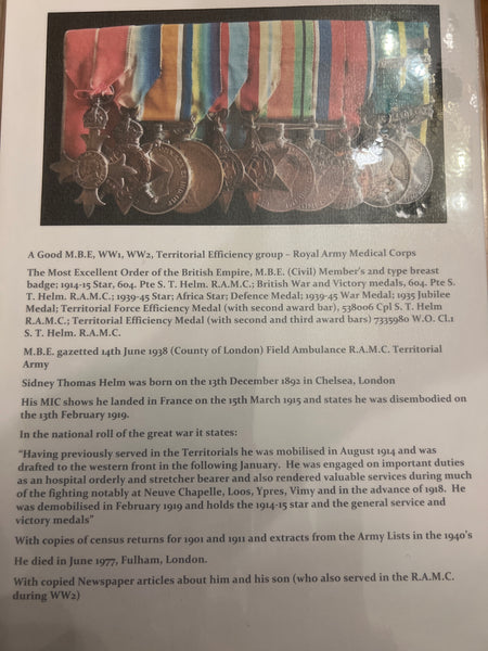 Group of 11 to Regimental Quarter Master Sergeant Sidney Thomas Helm, Royal Army Medical Corps, born in Chelsea 1892, he landed in France on 15th March 1915, he was engaged in important duties as a hospital orderly and stretcher bearer, he was present at Neuve Chapelle, Loos, Ypres, Vimy Ridge, and the Advance of 1918, after the war he served in the Territorial Army (with bar), then second medal with 2 bars, present at the 1935 Jubilee, received his M.B.E. from the King on 9th June 1938, then served in WW2 from 1940-44 in the Royal Army Medical Corps as Regimental Sergeant Major, see history with news cutting showing he served as a bus conductor after the Second War, Hammersmith Garage, died 1977, a good long service group