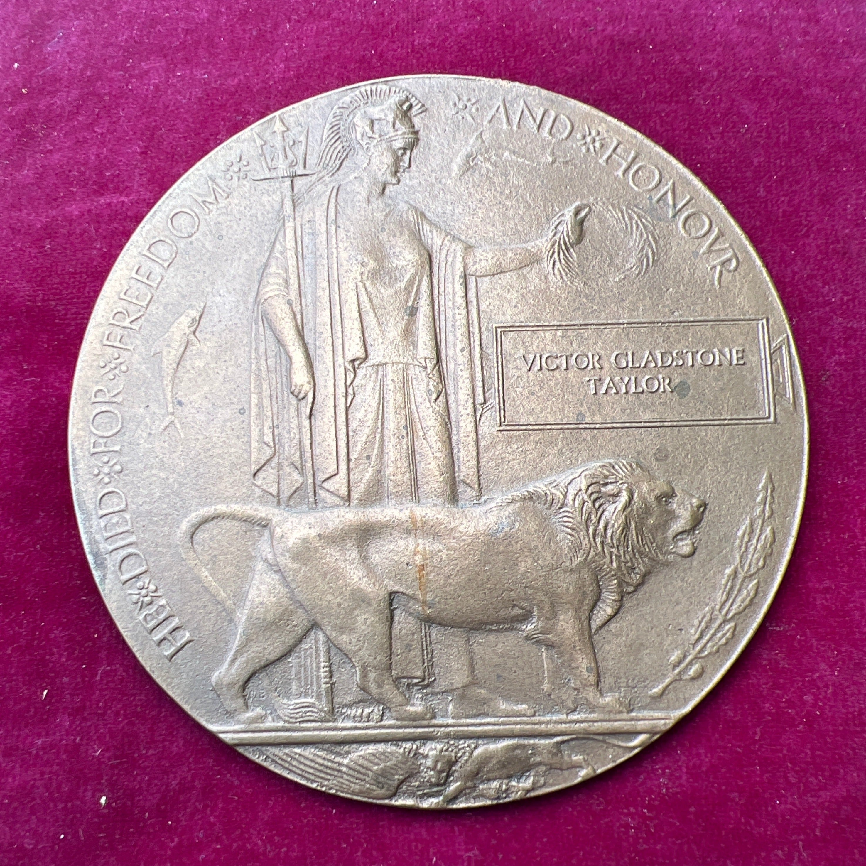 Memorial Plaque to Able Seaman Victor Gladstone Taylor, Drake Battalion, Royal Naval Division. Killed in action 25th March 1918, aged 19, he came from 63 Lillie Road, Fulham, London, remembered with honour at Arras Memorial