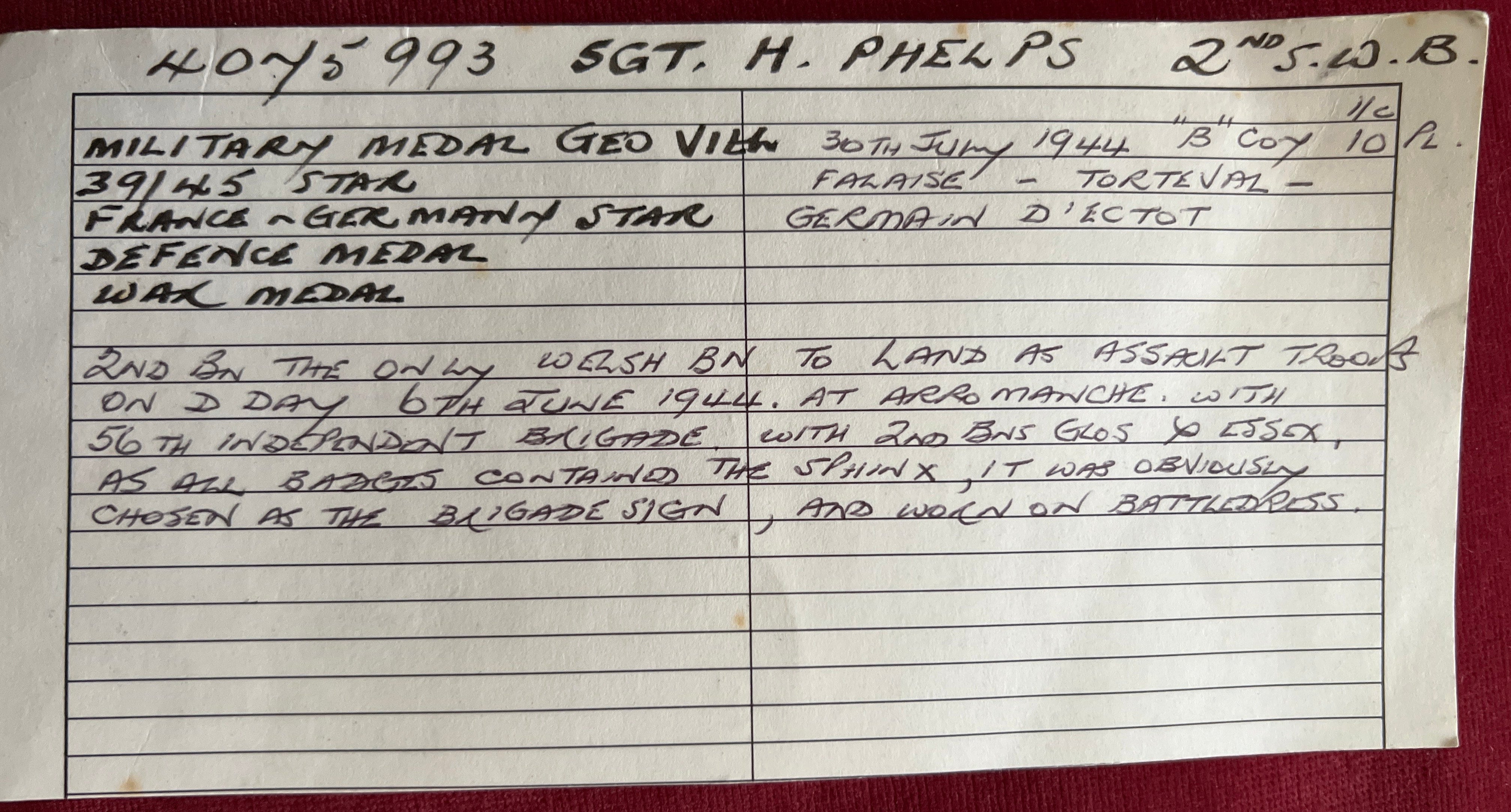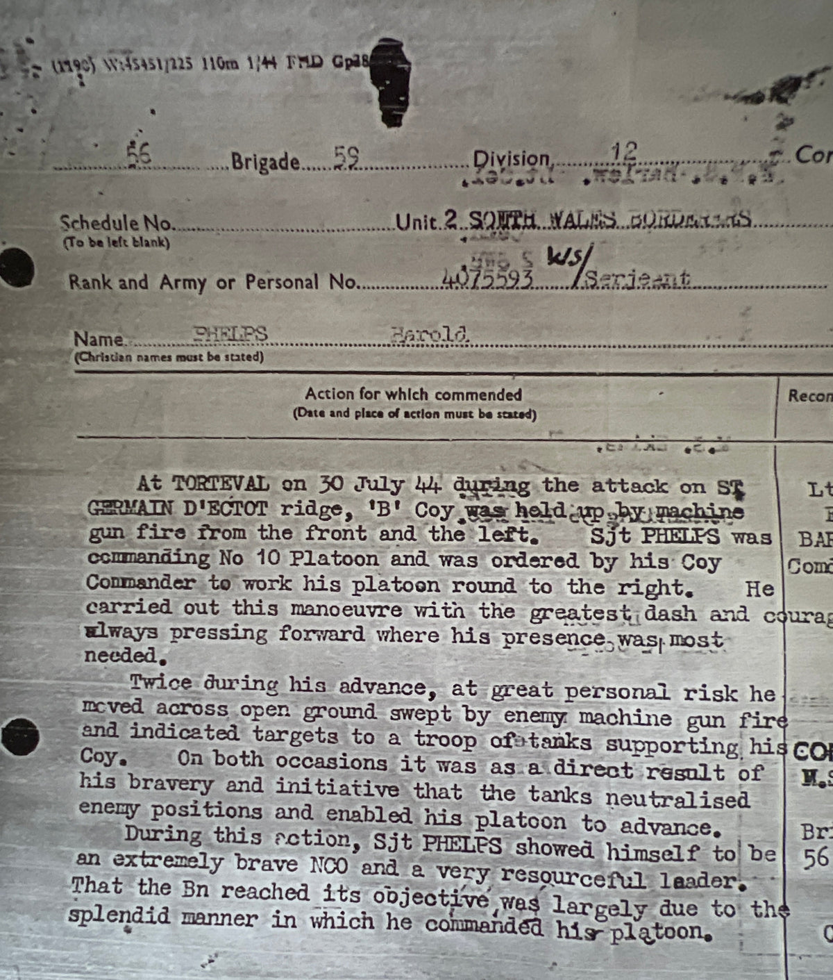 WW2 Military Medal to 4075593 W.S. Serjeant Harold Phelps, to the 2 South Wales Border Regiment, for an Action During D.Day at Saint Germain D,Ectot Ridge 30 July 1944, see citation, this signed by LT. Colonel Barlow, commander of the 2 South Wales Border Regiment and Montgomery, scarce M.M., good history.