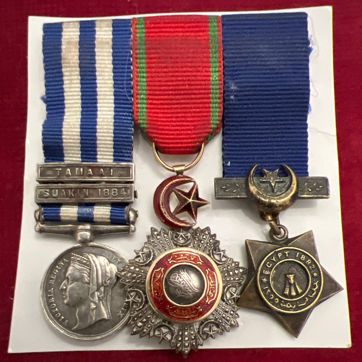 Miniature group of 3: Egypt Medal, 2 bars: Tamaai & Suakin 1884, Turkey Order of the Medjidie, knight, & Khedive's Star dated 1882, a nice group