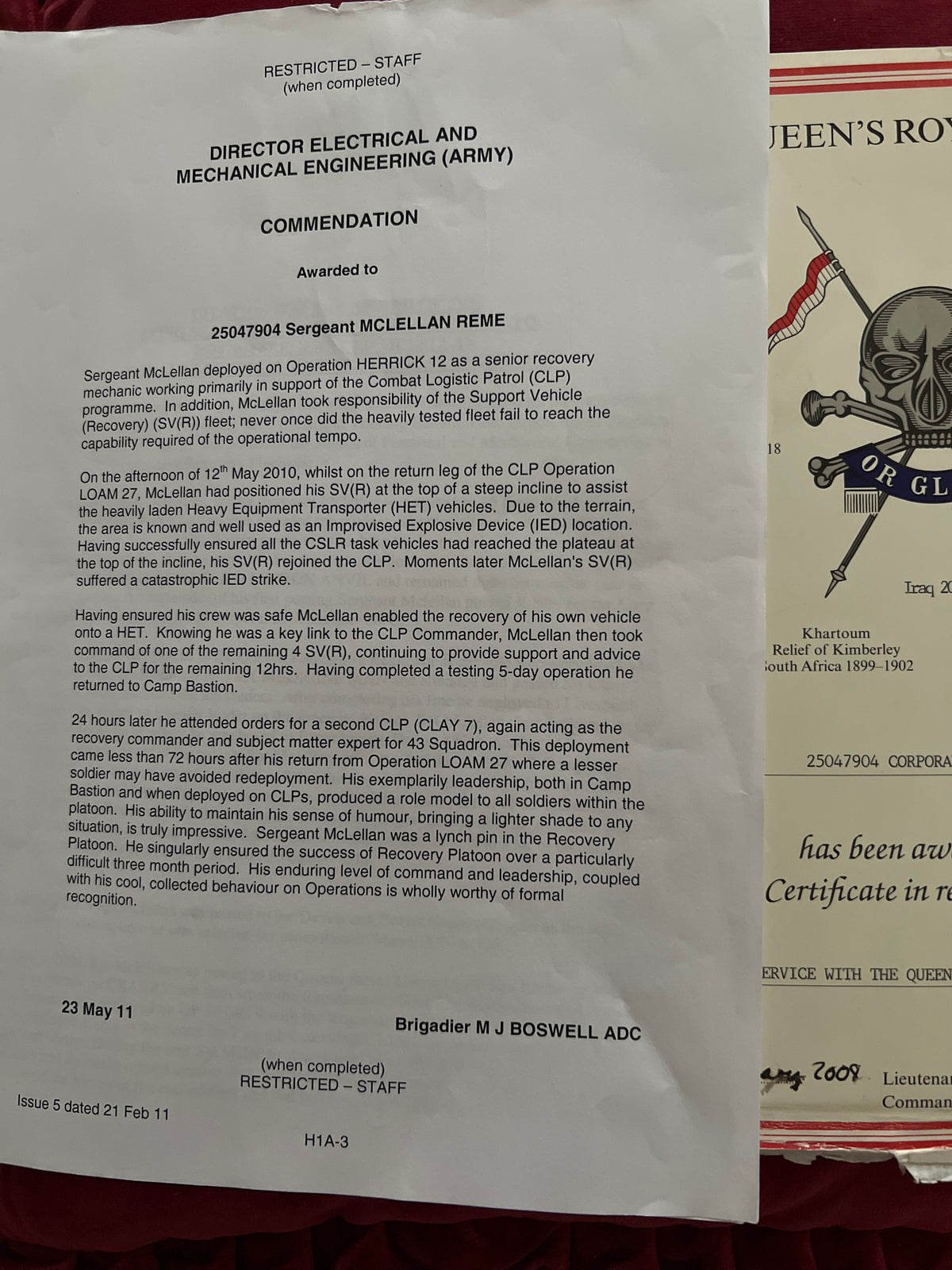 Modern group of 7 to 25047904 Sergeant L. D. McLellan, Royal Electrical Mechanical Engineers, awarded a commendation on 12th May 2010, see citation, comes with original photos, news cutting, and a certificate from the Queen’s Royal Lancers 11th January 2008, a good lot