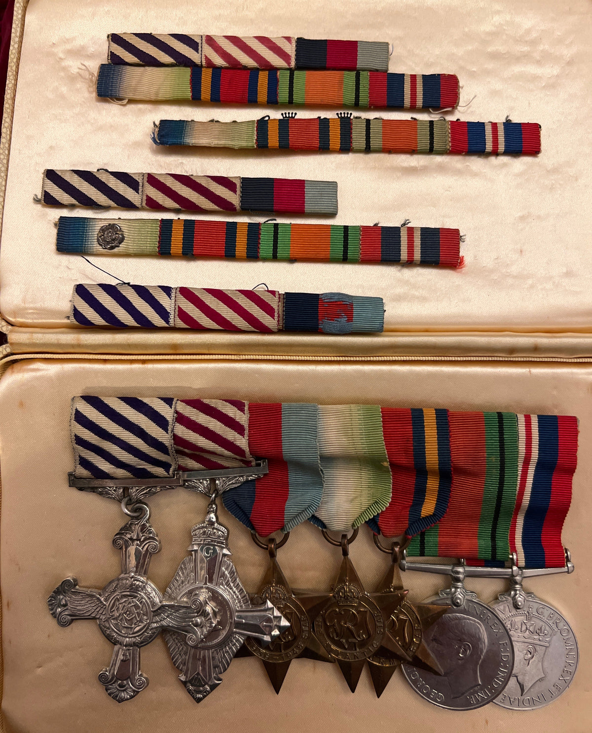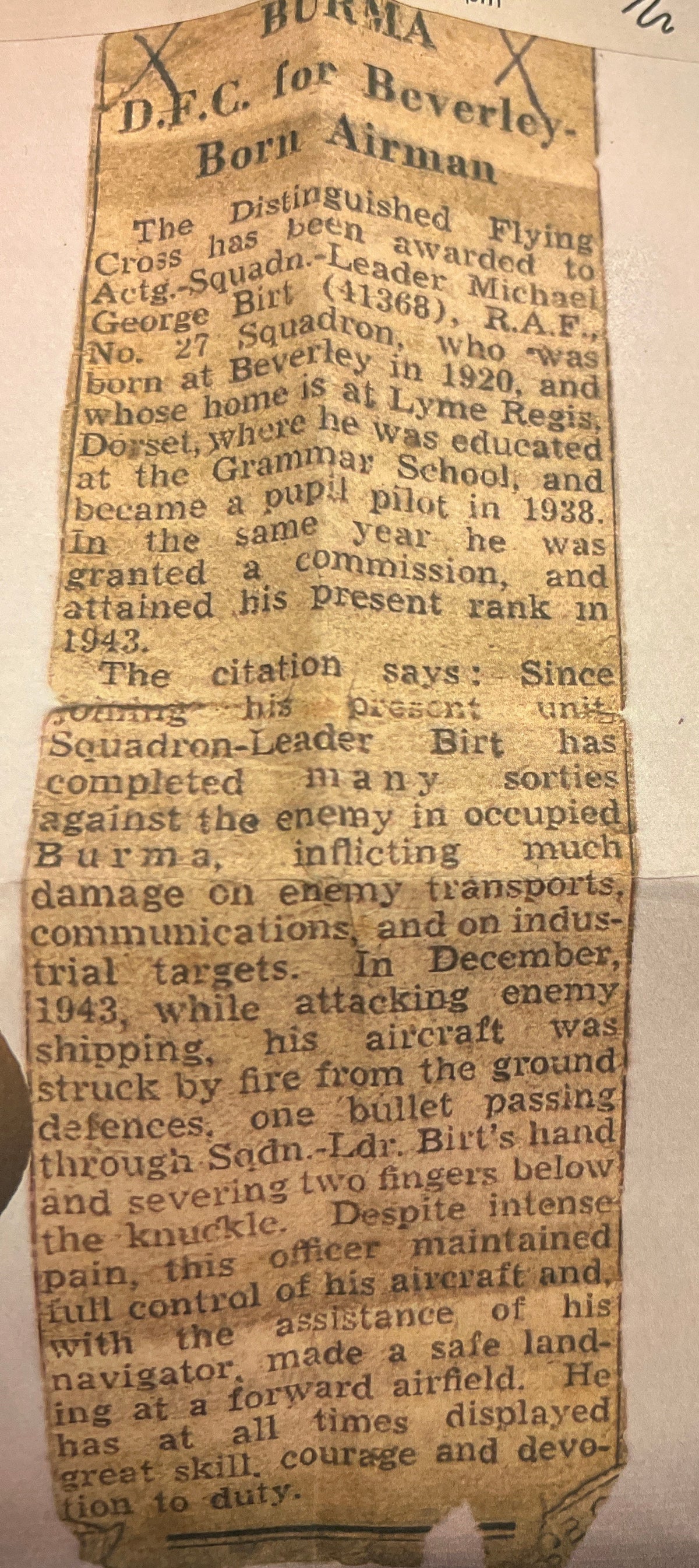 Royal Air Force group of seven to Acting Squadron Leader Michael George Birt (41368), comprising the Distinguished Flying Cross, Air Force Cross (1 January 1946), 1939-45 Star, Atlantic Star, Burma Star, Defence Medal and War Medal; Birt served with No. 27 Squadron, flying Beaufighters on Coastal Command and later Mosquito aircraft in Burma, where he earned the DFC announced 5 May 1944; after the war he returned to the U.K. as an instructor and was awarded the AFC; group accompanied by his original ribbon bars and photocopies of contemporary newspaper cuttings, an interesting lot