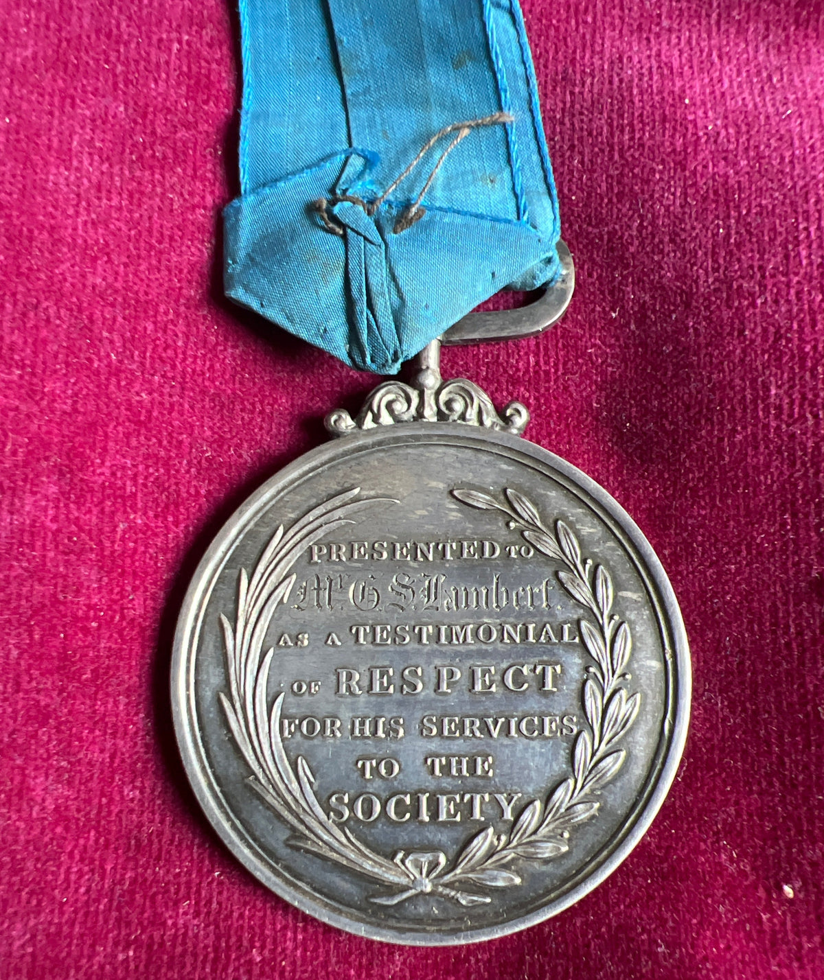 Royal Standard Benefit Society medal, 1828, Reward of Merit, presented to Mr S. Lambert as a testimonial of respect for his services to the society