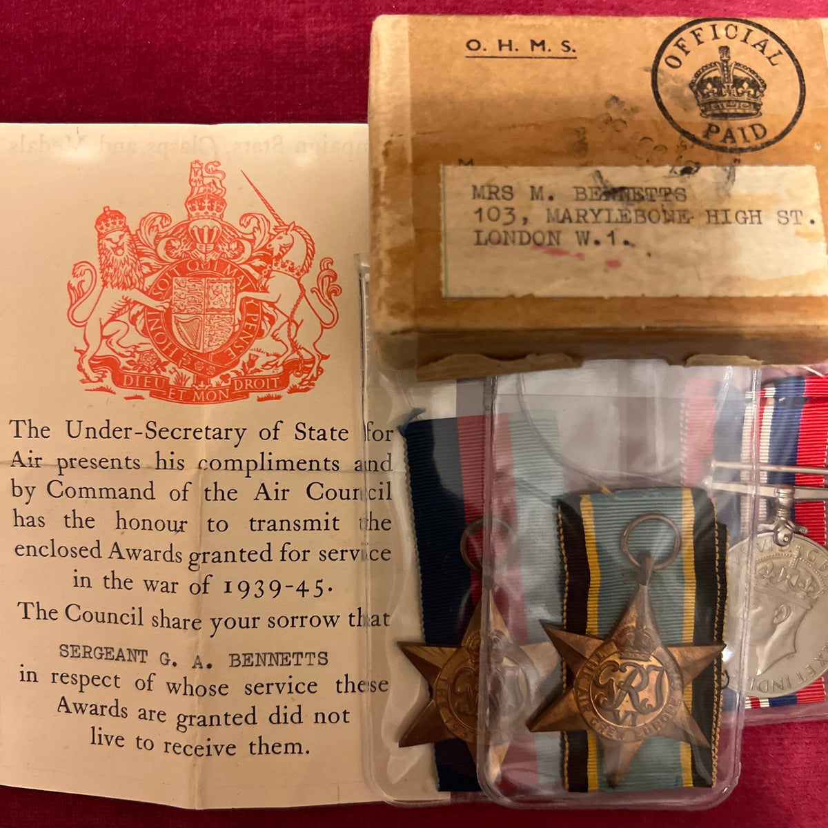Sergeant Geoffrey Andrew Bennetts, Wireless Operator and Air Gunner in 99 Squadron, RAF. He was lost during a bombing mission on Berlin on May 9th, 1941. Bennetts was last heard calling for help at 5:20 am, posthumously MiD, LG: January 1942, see history