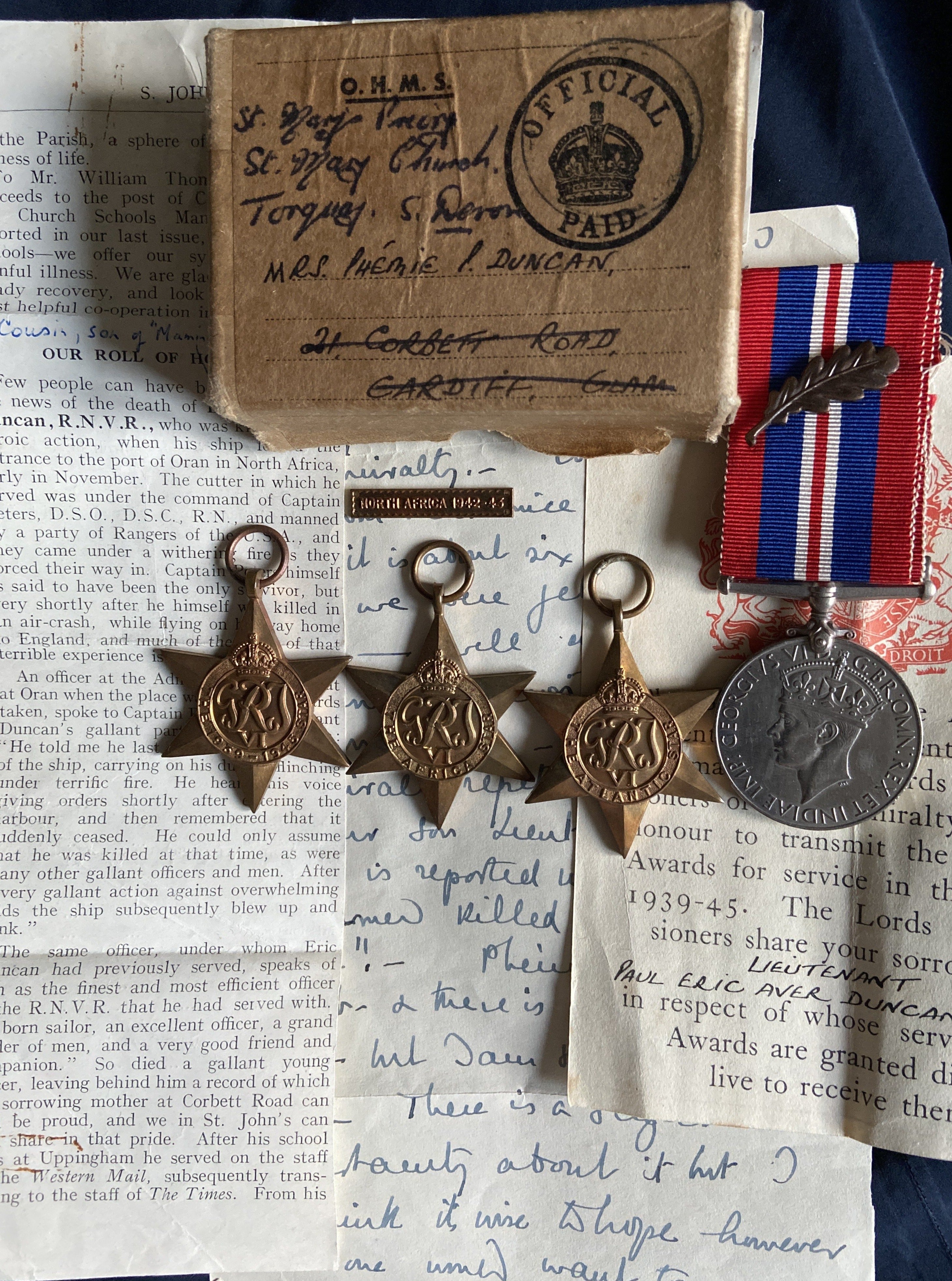 The incredible group of medals plus MiD, to Lt. Eric Aver Duncan, Royal Naval Volunteer Reserve, who was killed in the Victoria Cross action on the port of Oran, North Africa. His ship, HMS Walney, was sunk in forcing entry to the habour. See description