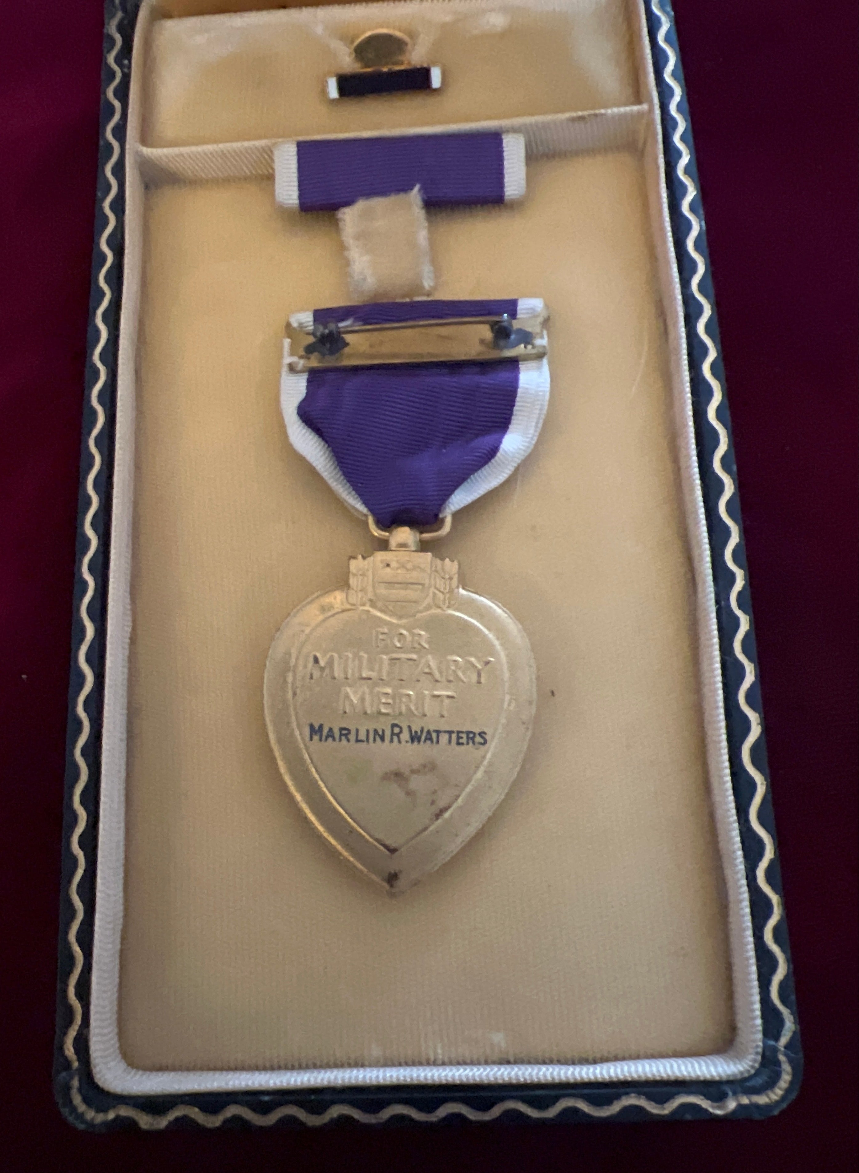 USA, Purple Heart, early issue, numbers on edge 428699, named to Marlin R. Watters, enamel type, in original case with pins
