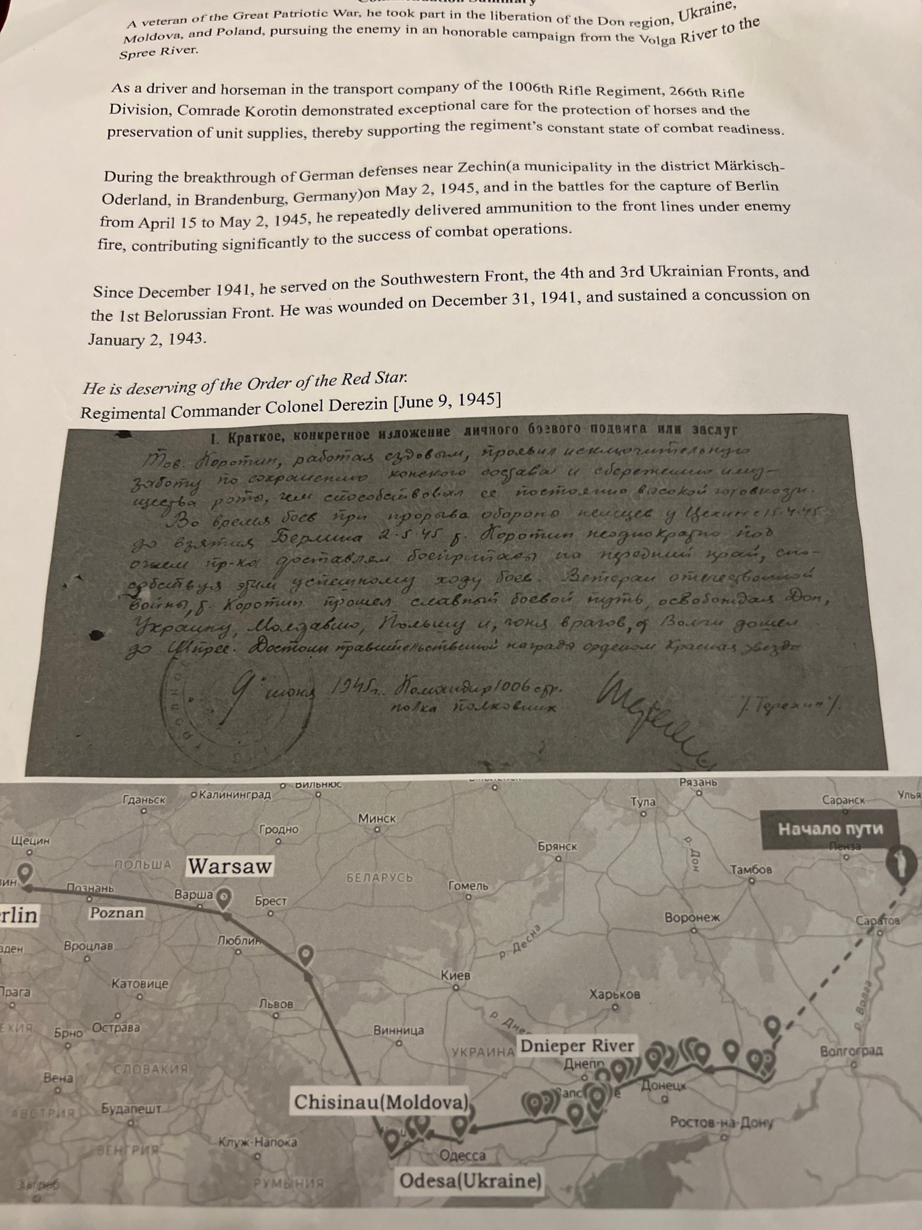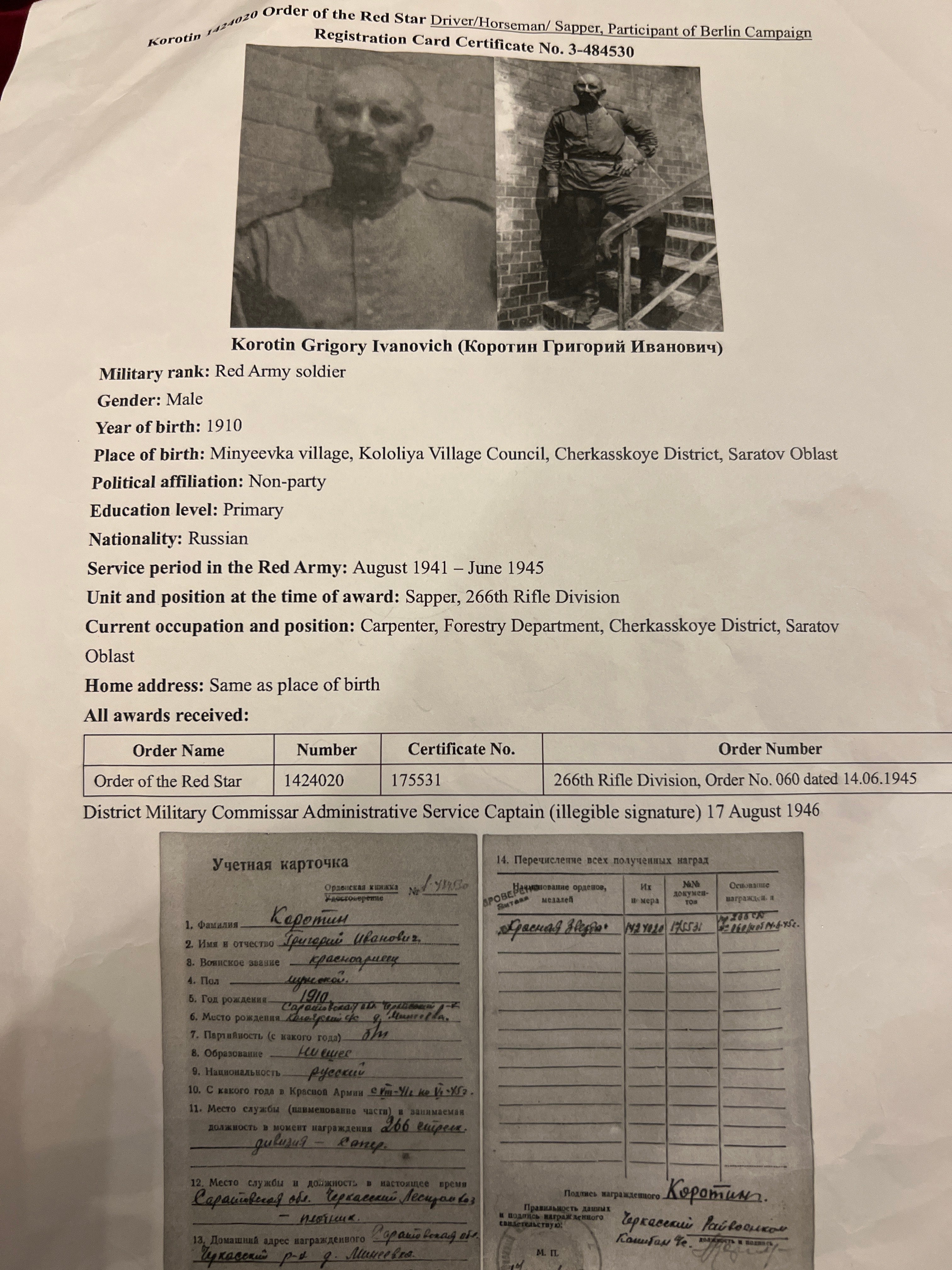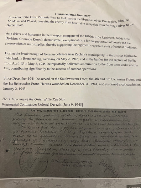 USSR, Order of the Red Star, awarded to Red Army soldier Grigory Ivanovich Korotin, driver and horseman with the 266th Rifle Division, for bravery and logistical service during the Berlin Campaign, see citation and history