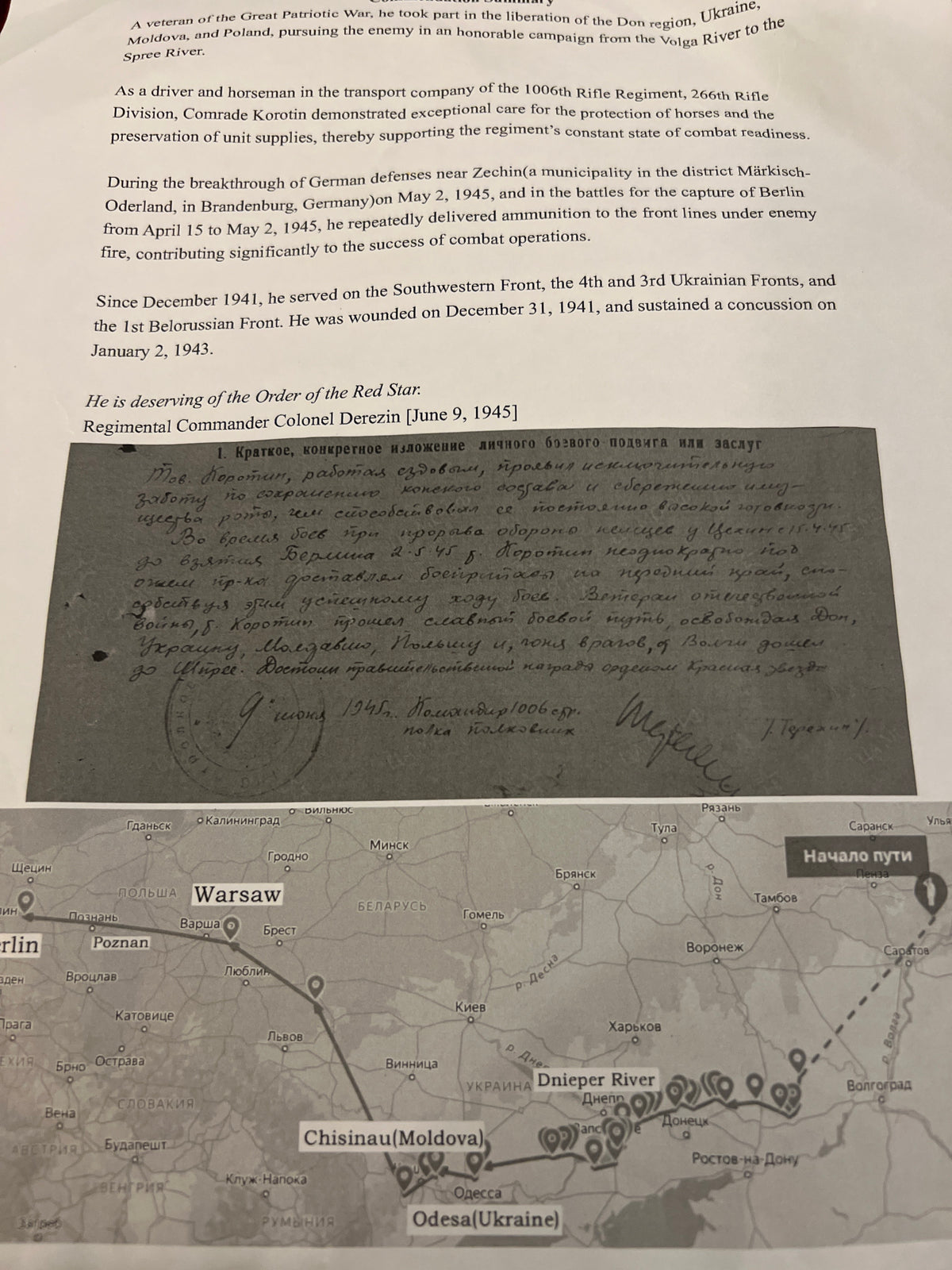 Since December 1941, he served on the Southwestern Front, the 4th and 3rd Ukrainian Fronts, and the 1st Belorussian Front. He was wounded on December 31st 1941, and sustained a concussion on January 2nd 1943.
