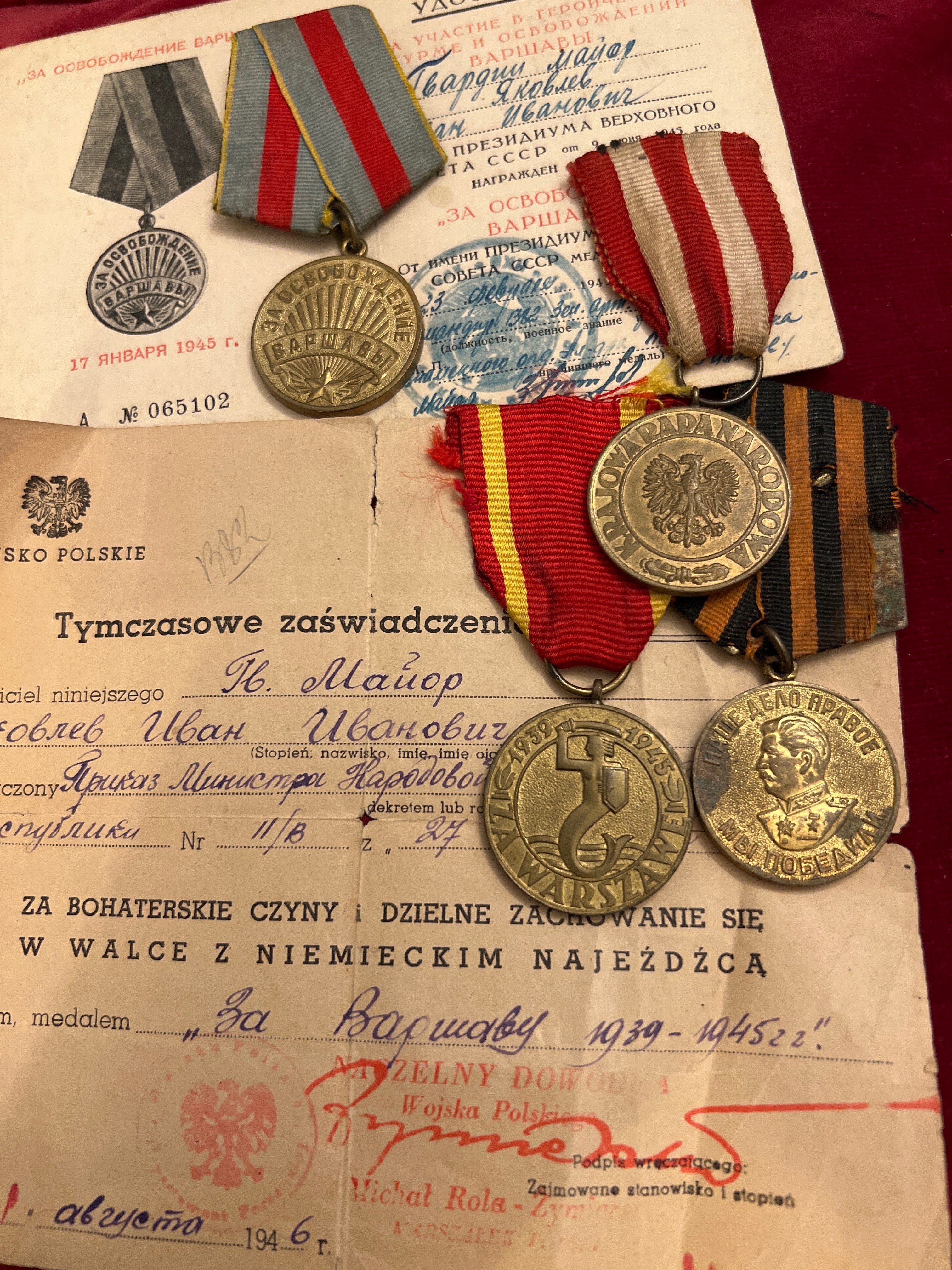 USSR, WWII group to Yakovlev Ivan Ivanovich, Guards Major, born Michurinsk, Tambov Oblast, he served with the Poles in WWII in the Liberation of Warsaw, only his campaign medals and award documents survive, with some photocopies of history