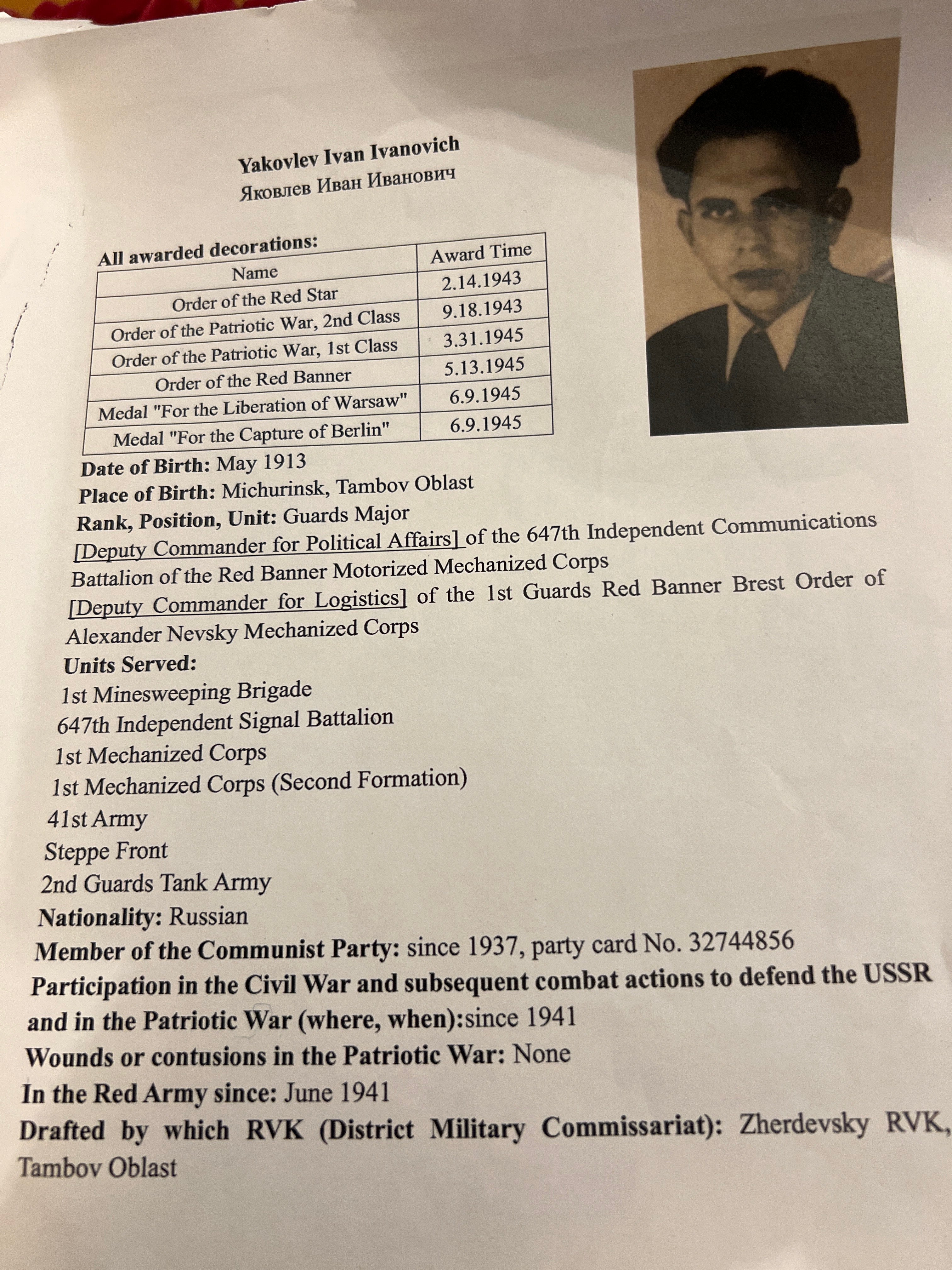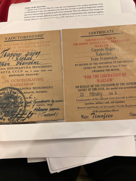 USSR, WWII group to Yakovlev Ivan Ivanovich, Guards Major, born Michurinsk, Tambov Oblast, he served with the Poles in WWII in the Liberation of Warsaw and was awarded Order of the Red Star, Order of the Patriotic War, 2nd Class, Order of the Patriotic War, 1st Class, Order of the Red Banner, Medal "For the Liberation of Warsaw", Medal "For the Capture of Berlin", only his campaign medals and award documents survive, with some photocopies of history