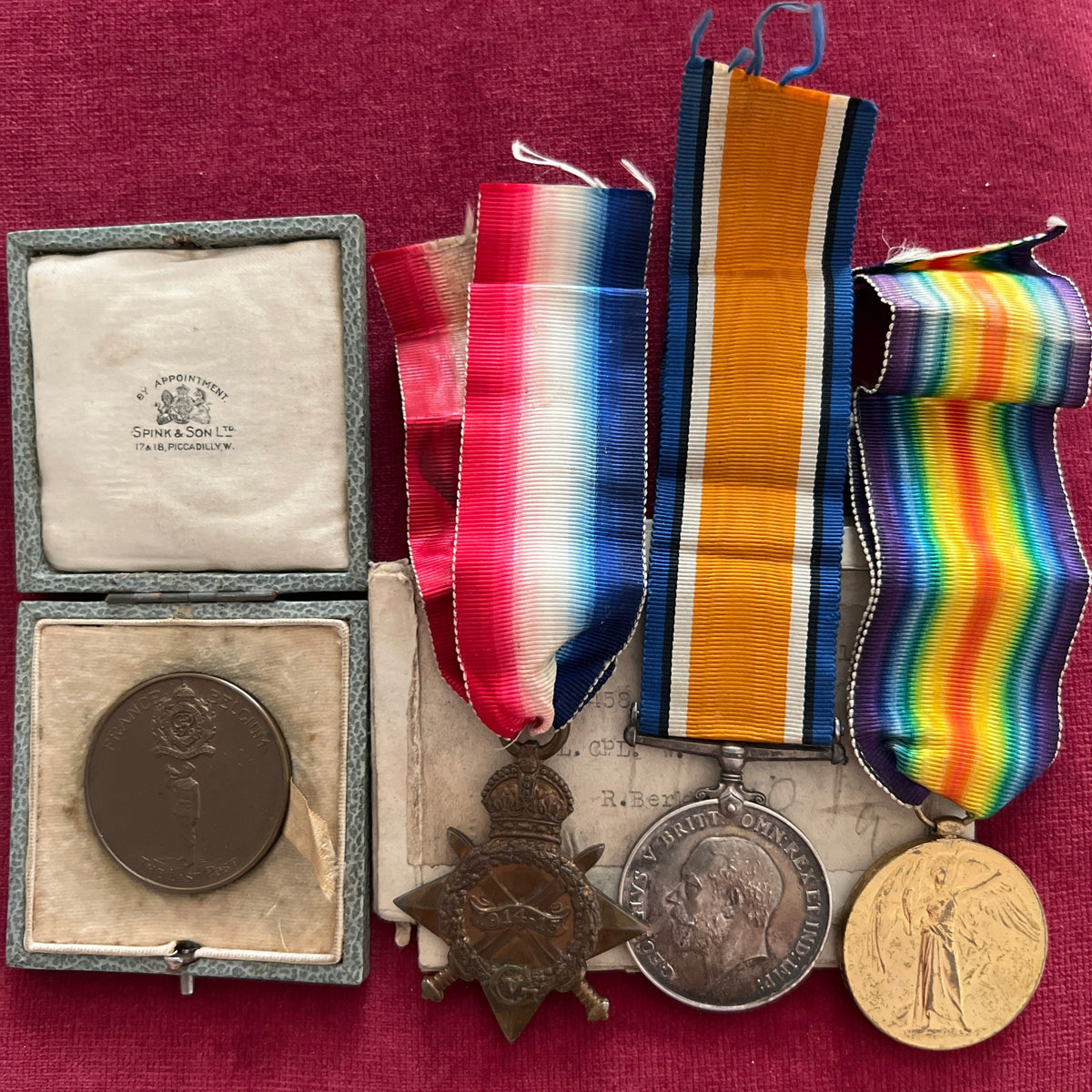 WW1 trio and bugling medallion named to Lance Corporal William Langridge, Berkshire Regiment, attached to 264 Railway Construction Company, with full service papers