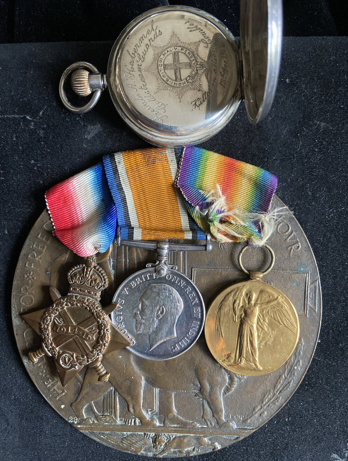 WW1 trio & Memorial Plaque to 13382 Pte. Arthur Edward Habermel, 4th (Pioneer) Battalion, Coldstream Guards. Killed in action 13/12/1916, Combles, with engraved watch presented to his family one year after his death, includes history