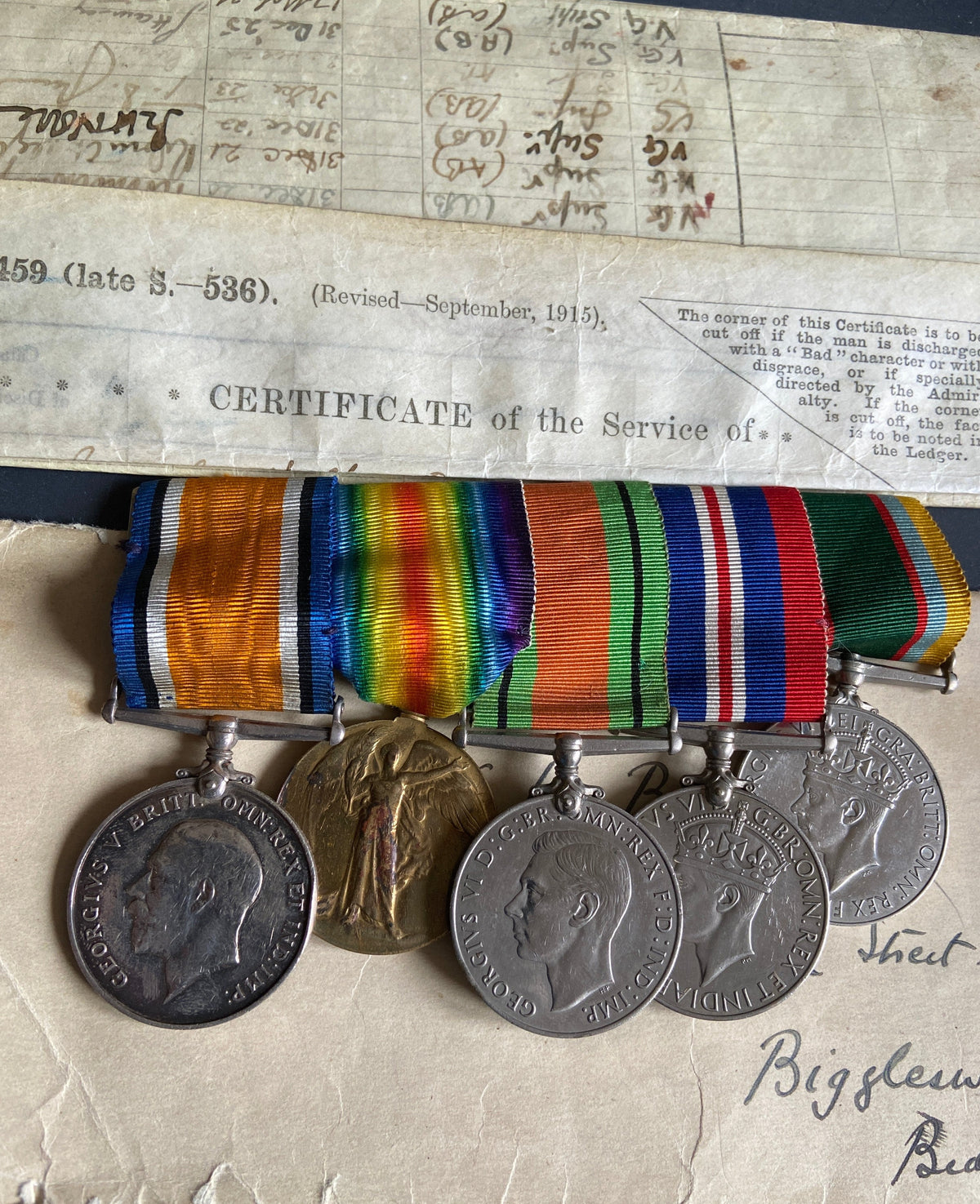 WW1/WW2 group of 5 to Lieutenant Commander Samuel Walter Bonfield, Royal Navy Volunteer Reserve, served 1917-1918 on HMS Monarch, later HMS Barham, Lieutenant Special Branch Cadet Medal 10/1/1952, with original service papers