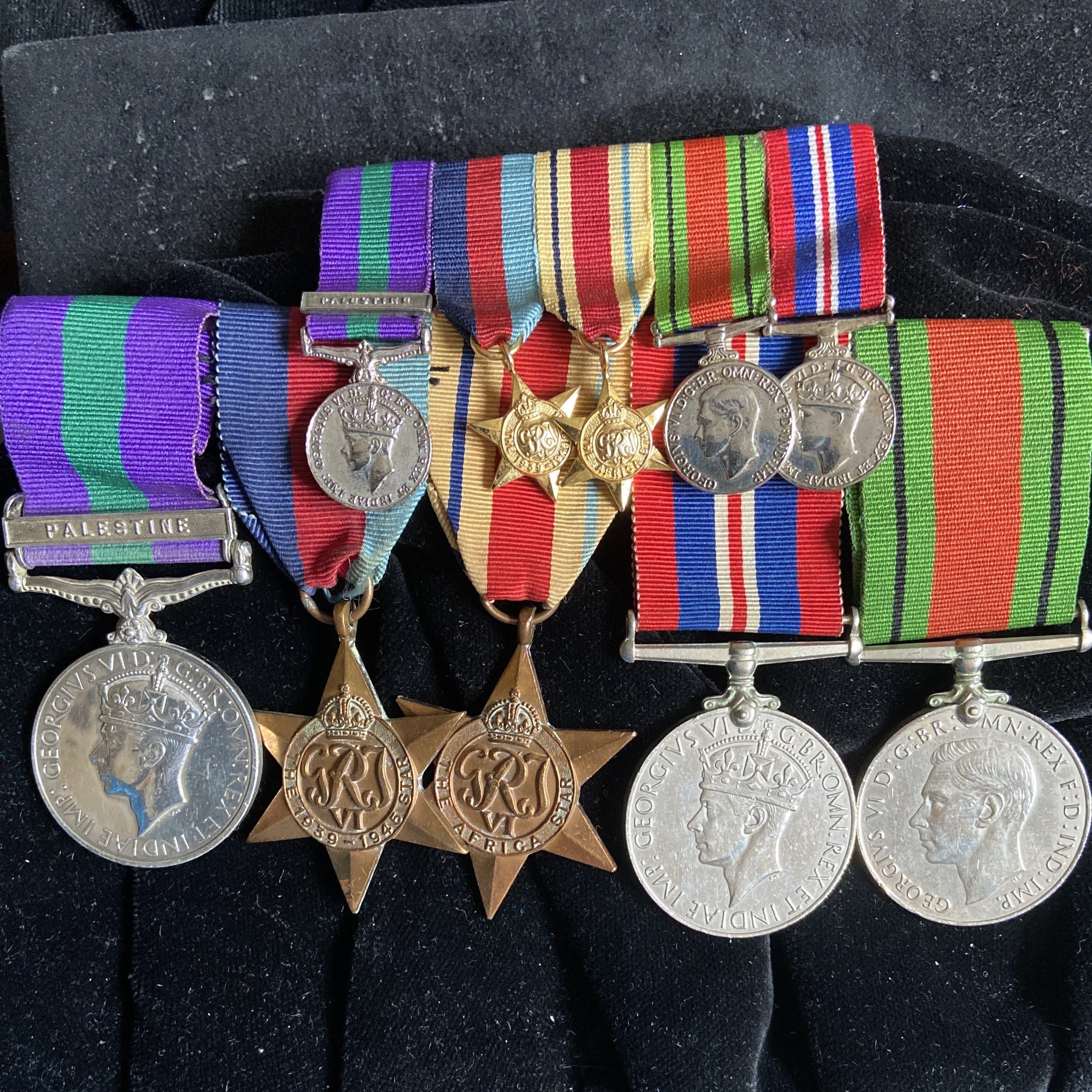 WW2 group of 5 to Pte. H. Styles, 2nd Bn., West Yorkshire Fusiliers. Pre-war Palestine GSM, 1939-45 Star, Africa Star, War Medal & Defence Medal, with miniatures