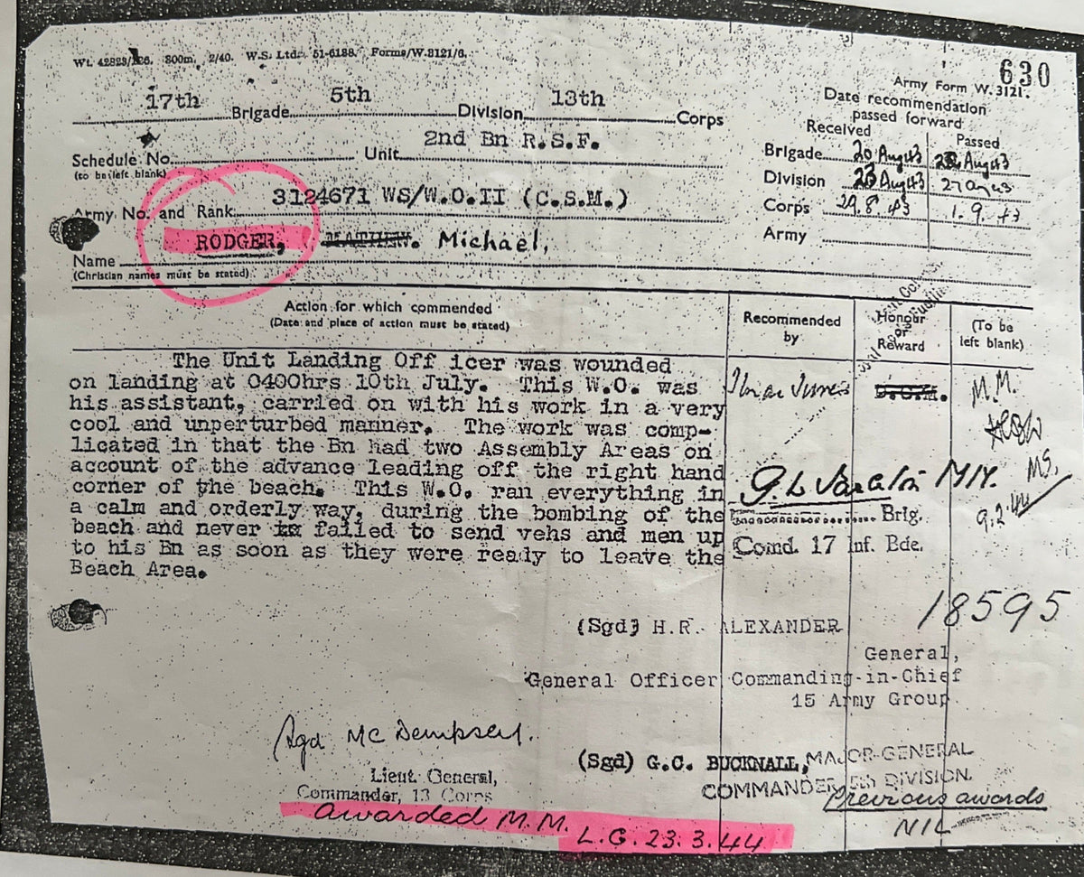 He was serving with the 2nd Battalion during the Sicily/Italian Campaign with the rank of Warrant Officer Class 2. Being awarded the Military Medal for his actions on 10/7/1943 during the landing at Sicily.