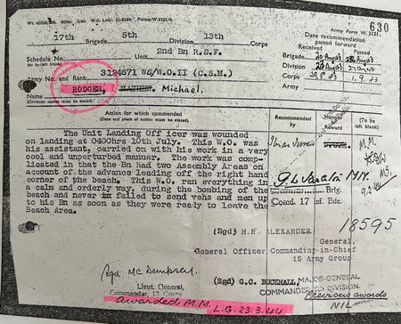Citation reading: 'The Unit Landing Officer was wounded on landing at 0400rs 10th July. This W.O. was his assistant, carried on with his work in a very cool and unperturbed manner. The work was complicated in that the bn had two assembly areas on account of the advance leading off the right-hand corner of the beach. This W.O. ran everything in a calm and orderly way, during the bombing of the beach and never failed to send veh and men up to his Bn as soon as they were ready to leave the Beach Area.'